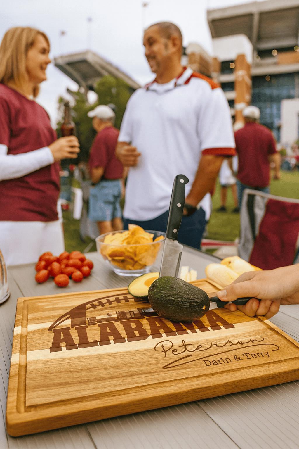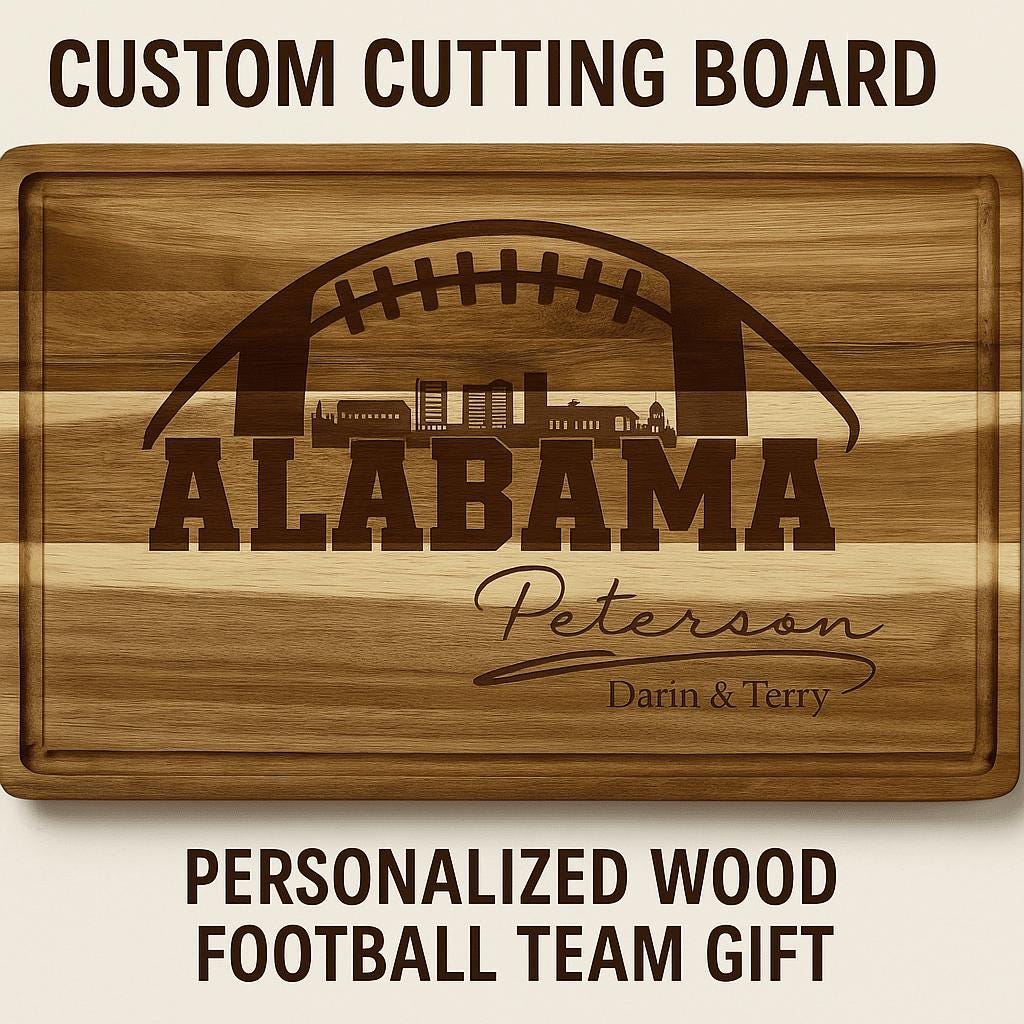 Show your love for Alabama and football with this custom laser-engraved wood cutting board. Crafted with care, this versatile board doubles as a beautiful serving tray or display piece for your kitchen, tailgate party, or family gatherings. Personalized with your name, family name, or message, it’s the perfect way to showcase both state pride and team spirit.