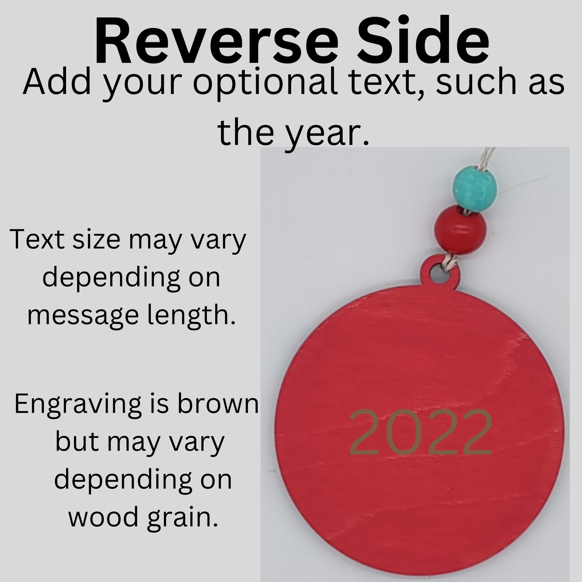 - Laser-Engraved Year: The year is laser engraved on the reverse side of the ornament. If you have a specific message or request, feel free to let us know. We are flexible with our designs and are happy to accommodate your needs.