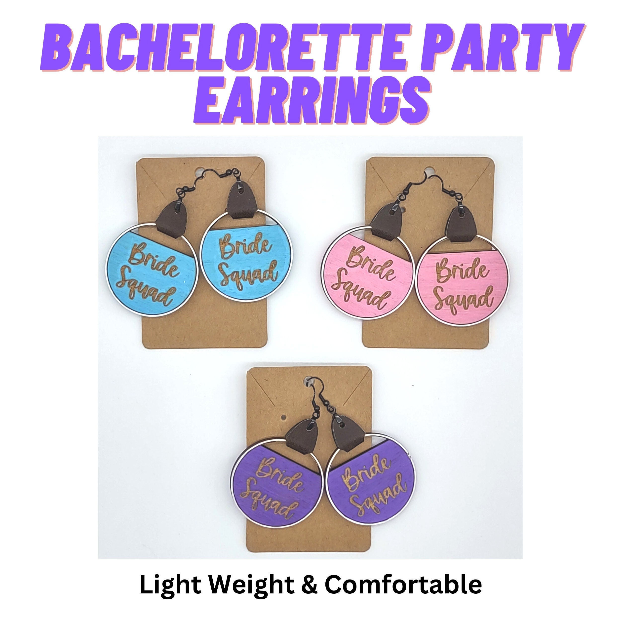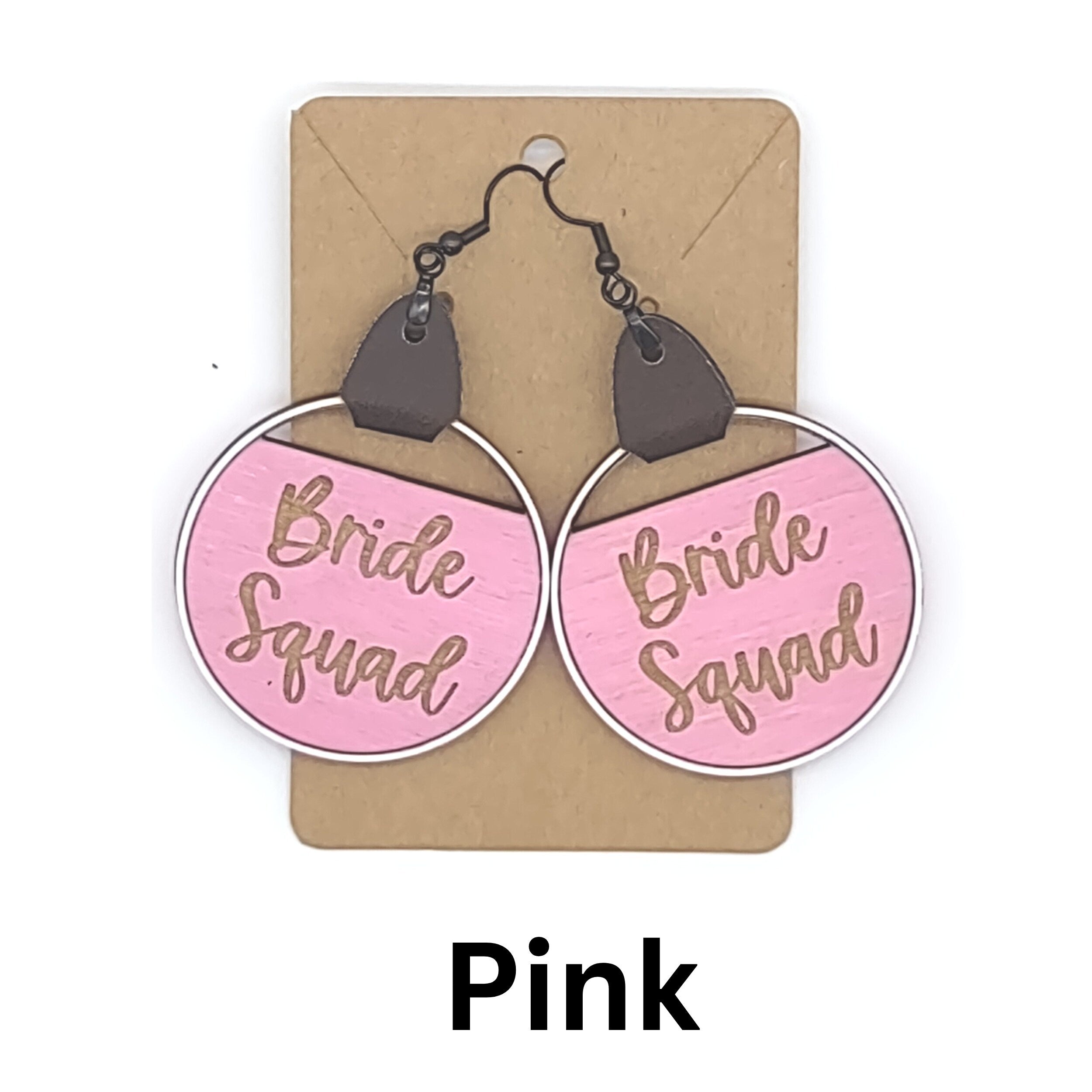 Bride and Bride Squad Designs: Choose from elegant "Bride" earrings for the leading lady or "Bride Squad" earrings for her entourage. Both designs are available in various eye-catching colors, allowing you to match your personal style or the wedding theme.