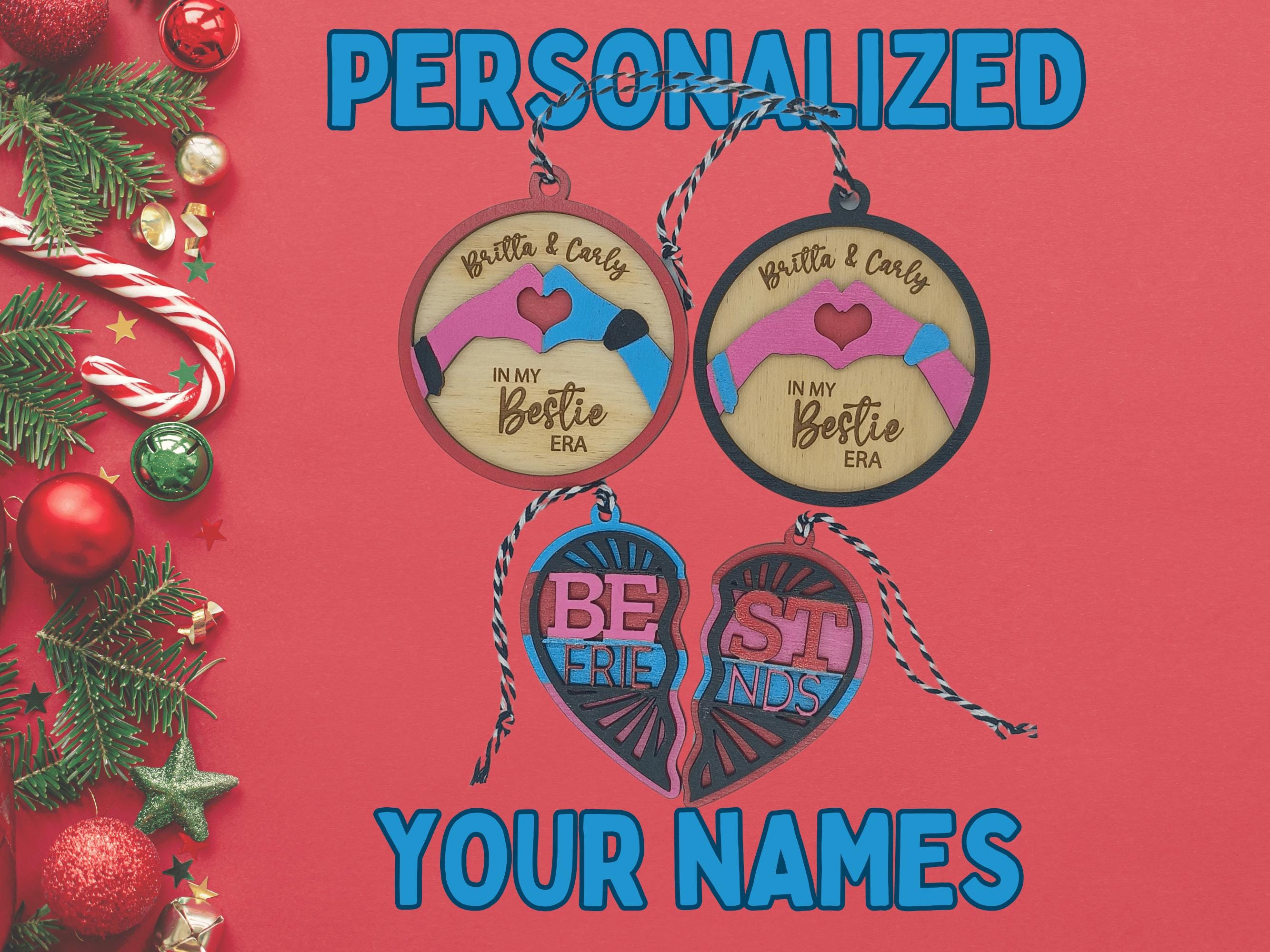 Each kit comes with everything you need to create four custom ornaments (two for each bestie). You’ll make a Bestie Era round ornament and one half of the split heart ornament, which can be personalized with names on the back for a heartfelt touch.