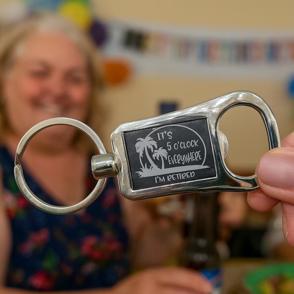Celebrate retirement in style with this silver and black metal keychain that comes with a built-in bottle opener. Laser engraved with the humorous message, "It's 5 O'clock Everywhere, I'm Retired," this keychain makes a fantastic retirement gift for co-workers and family members. It's the perfect way to kickstart the retirement celebration!