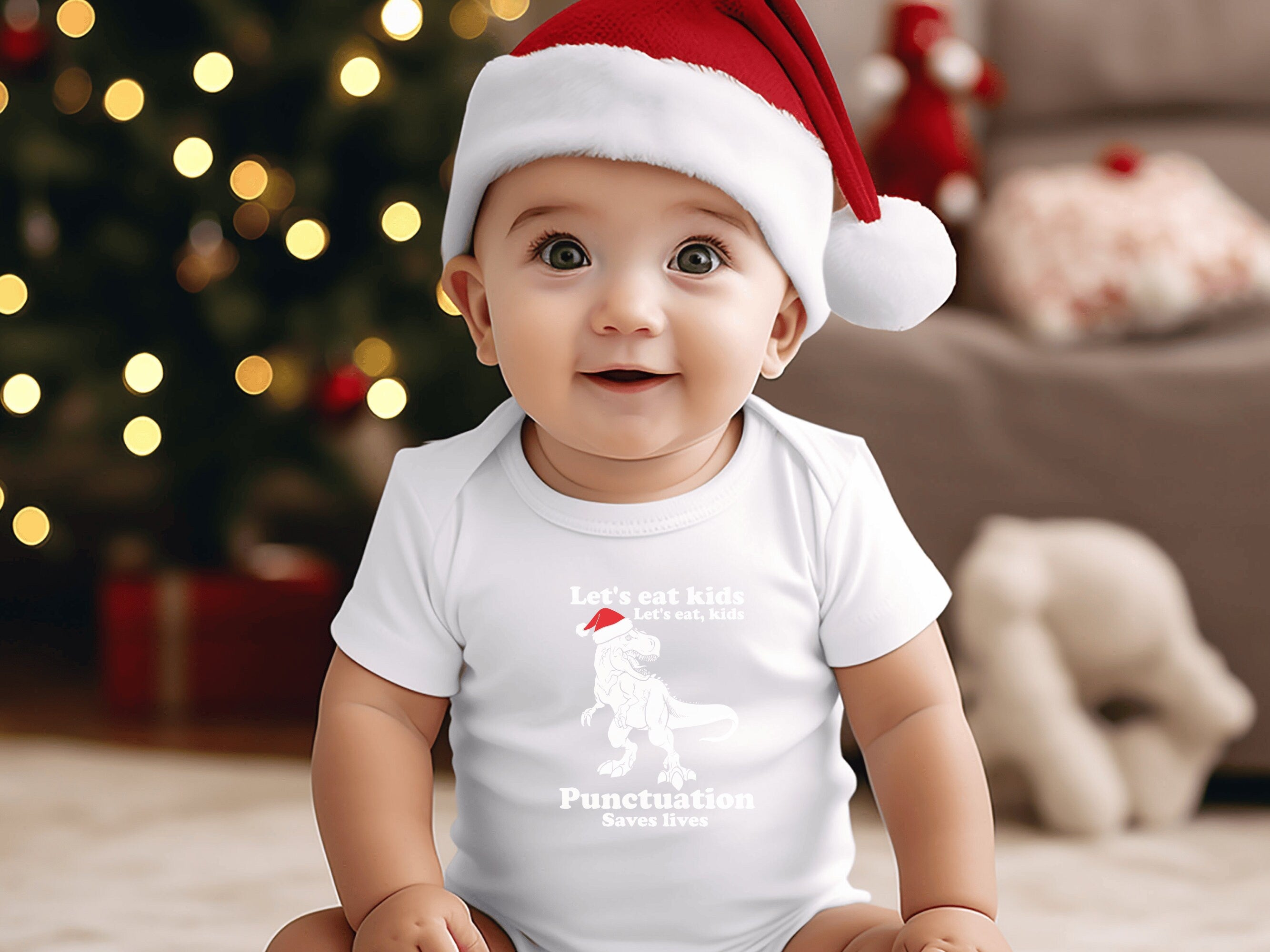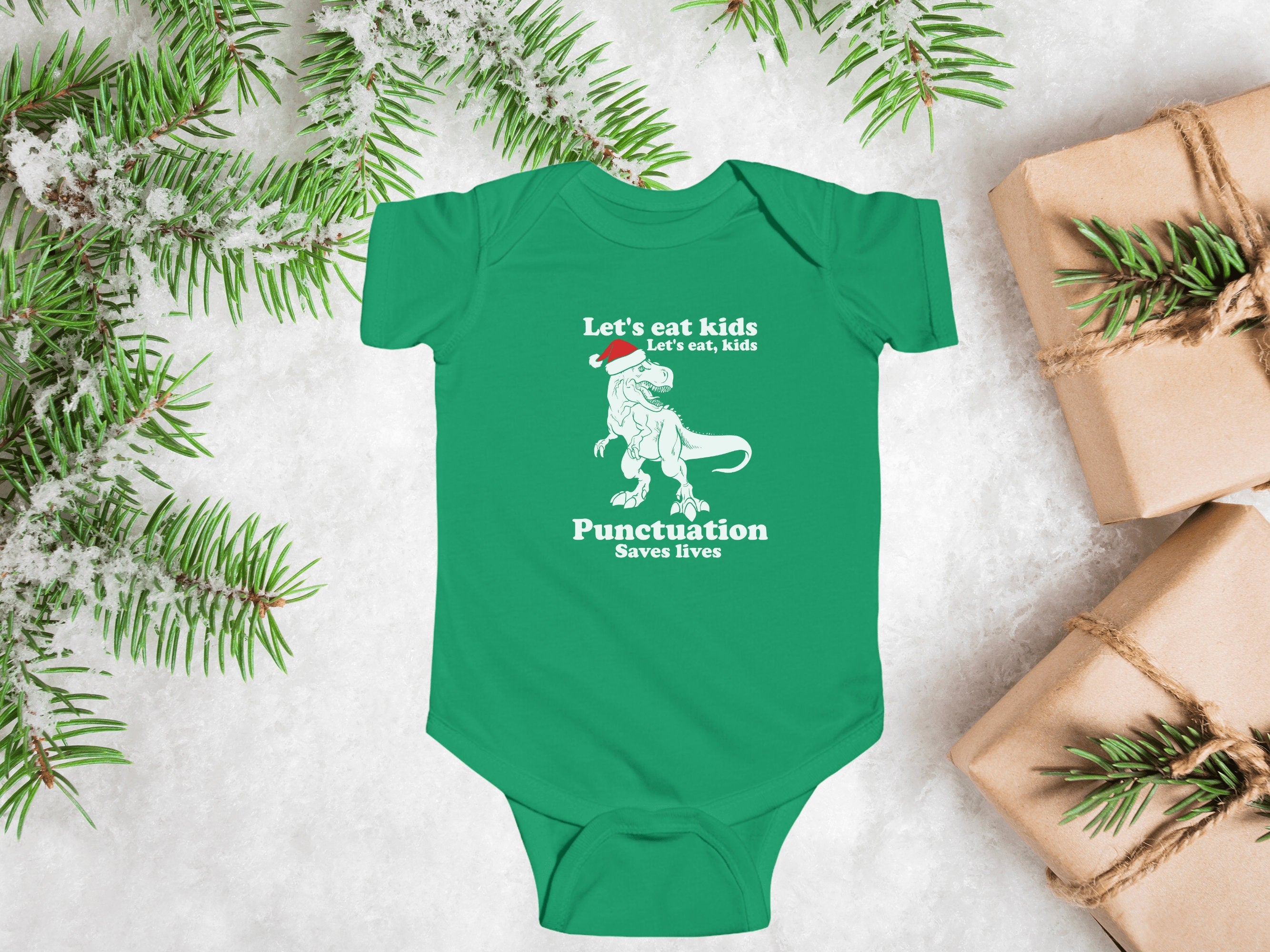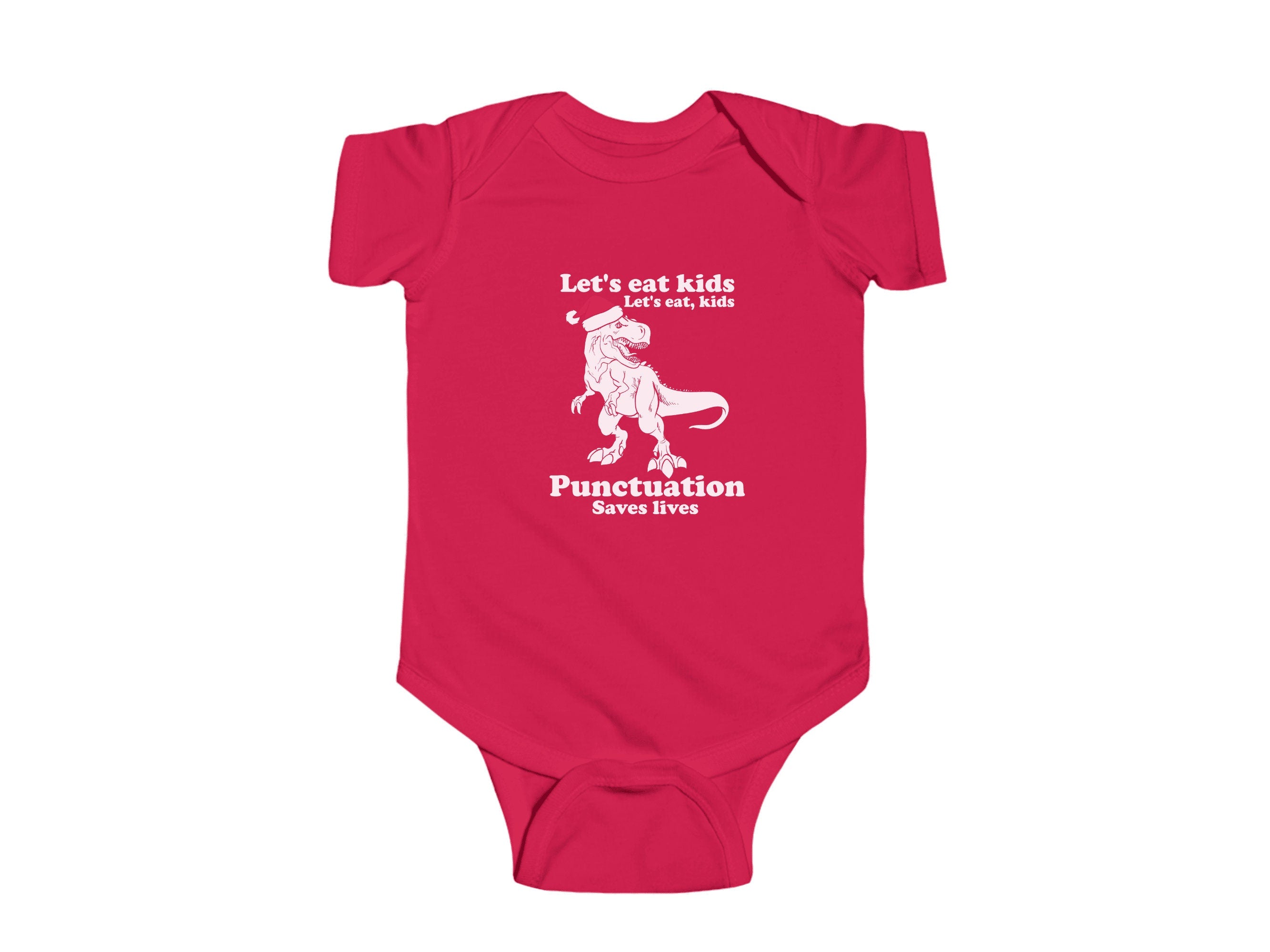 Dressing your little one for Christmas has never been so adorable. Order our "Let's Eat Kids, Lets Eat, Kids. Punctuation Saves Lives" holiday Baby Bodysuit today and let your infant join in the holiday fun in style and comfort.