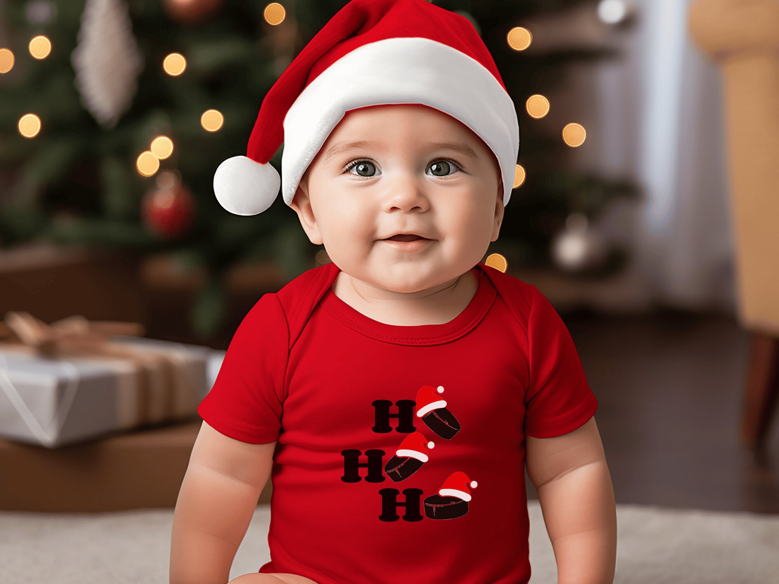 Dressing your little one for Christmas has never been so adorable. Order our "Ho Ho Ho Hockey Pucks" holiday Baby Bodysuit today and let your infant join in the holiday fun in style and comfort.