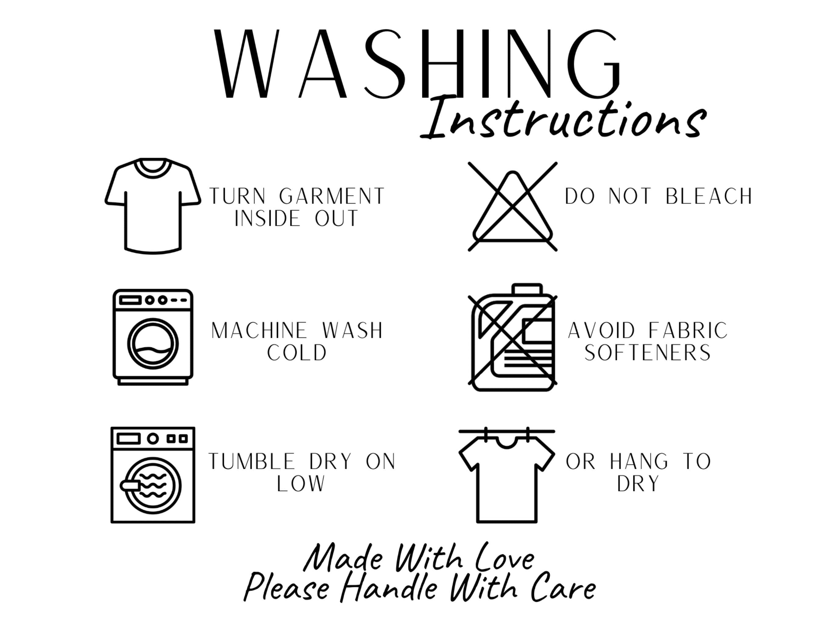 - Care Instructions: To keep this adorable bodysuit looking its best, be sure to follow these care instructions. Machine wash cold, inside out, with like colors, and use mild soap or liquid detergent only. Always remove the bodysuit from the washer promptly. You can hang it dry on wooden or plastic hangers, or use low heat if machine drying. Please remove it promptly when the cycle is completed. Avoid powdered detergent, ironing, dry cleaning, fabric softener, and hot water.