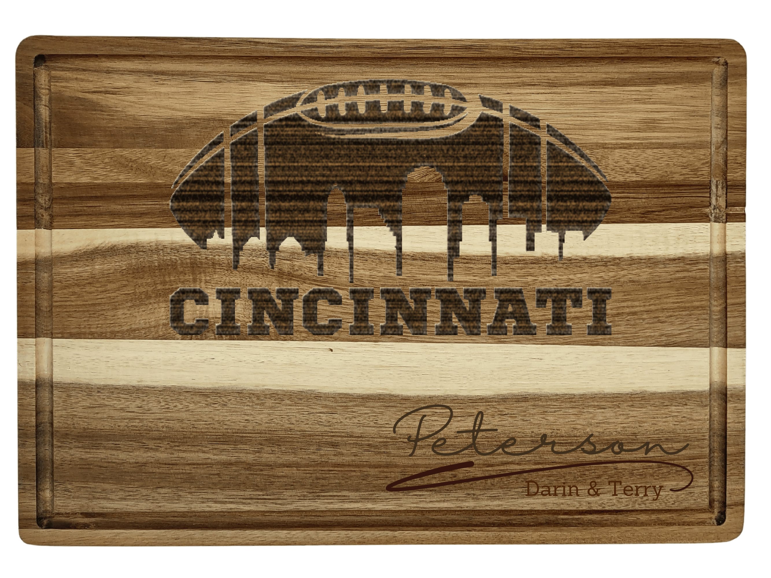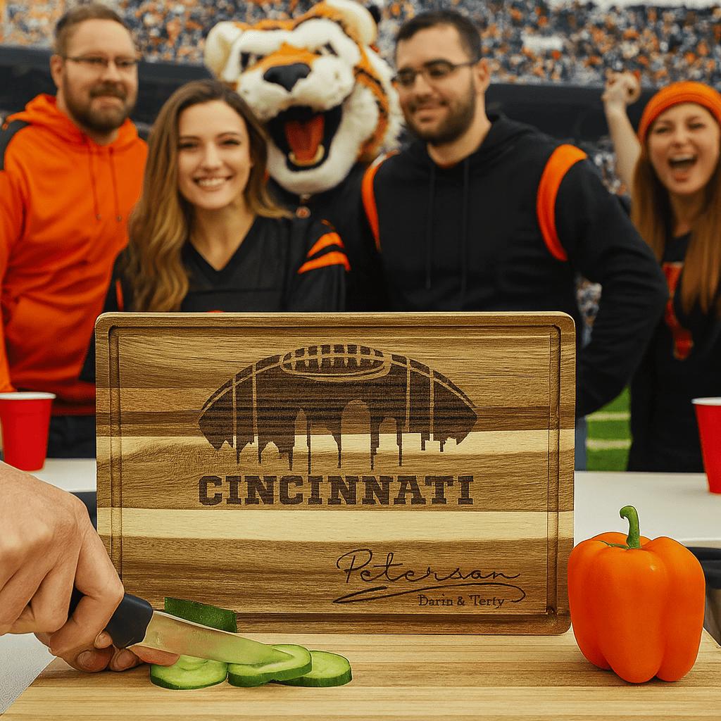 Looking for a meaningful and practical gift for a Cincinnati football fan? This personalized acacia wood cutting board is the ultimate combination of style, function, and sports pride. Perfect for everyday use, Super Bowl parties, or tailgating gatherings, this engraved board makes a lasting impression.