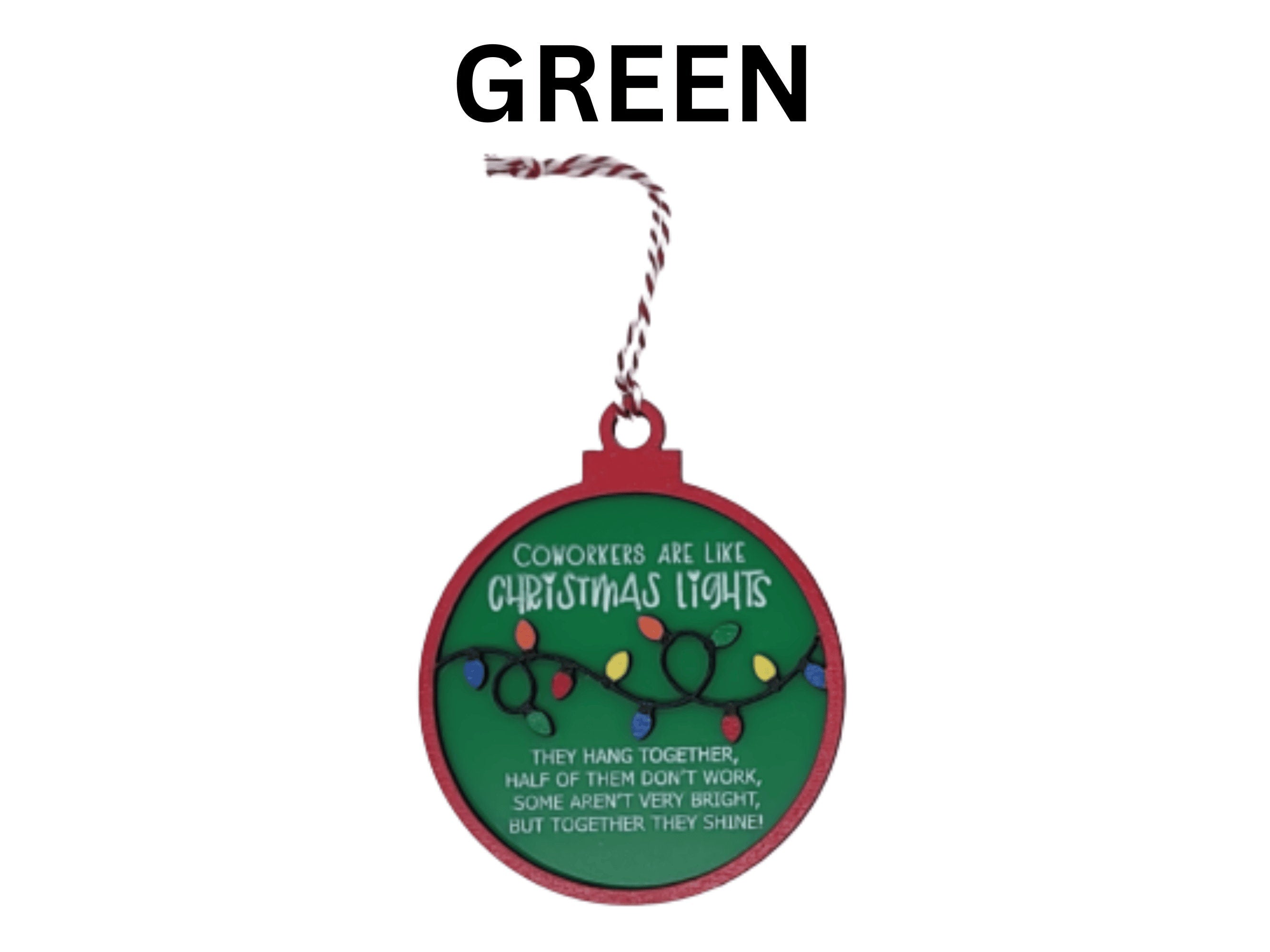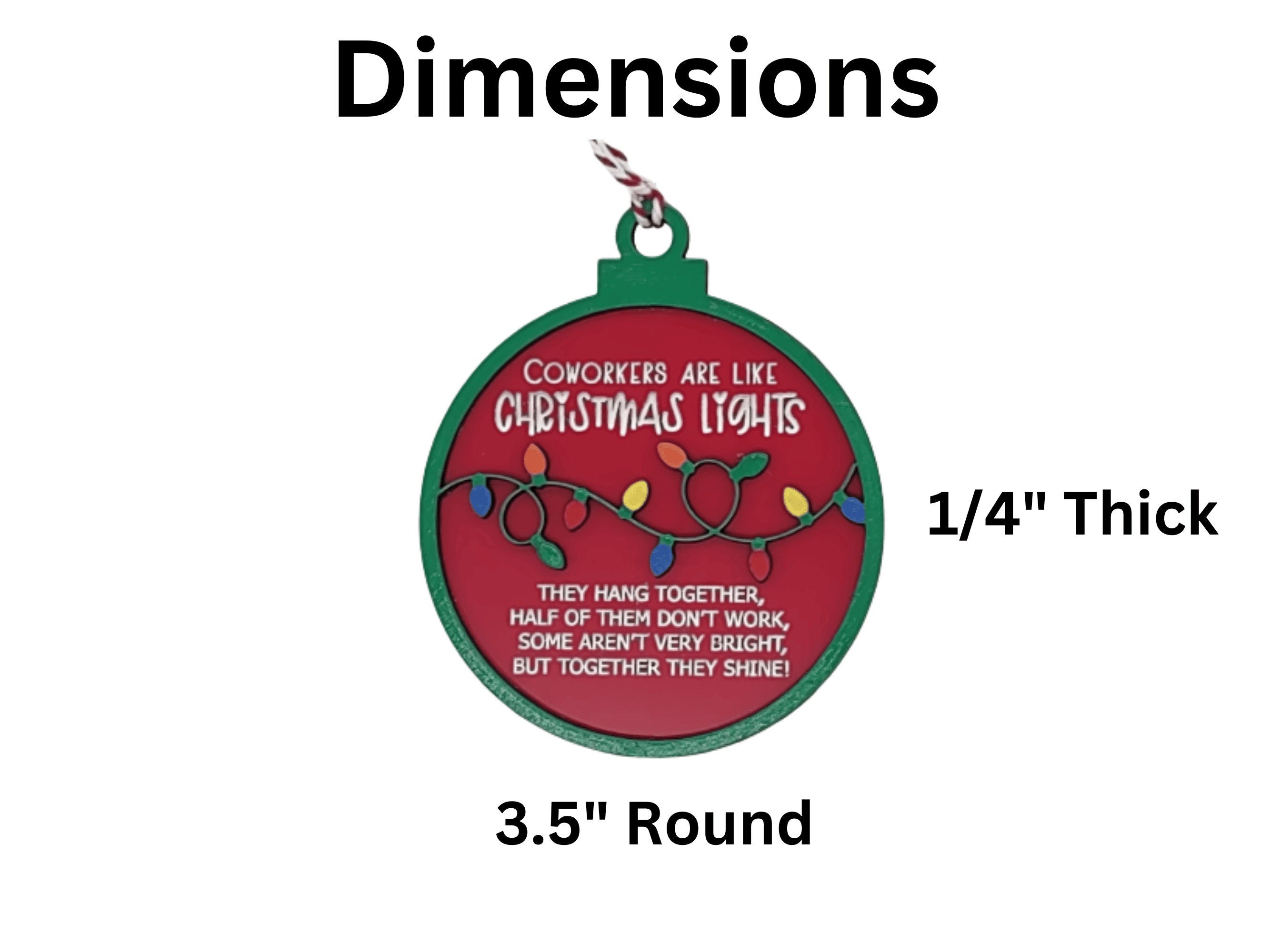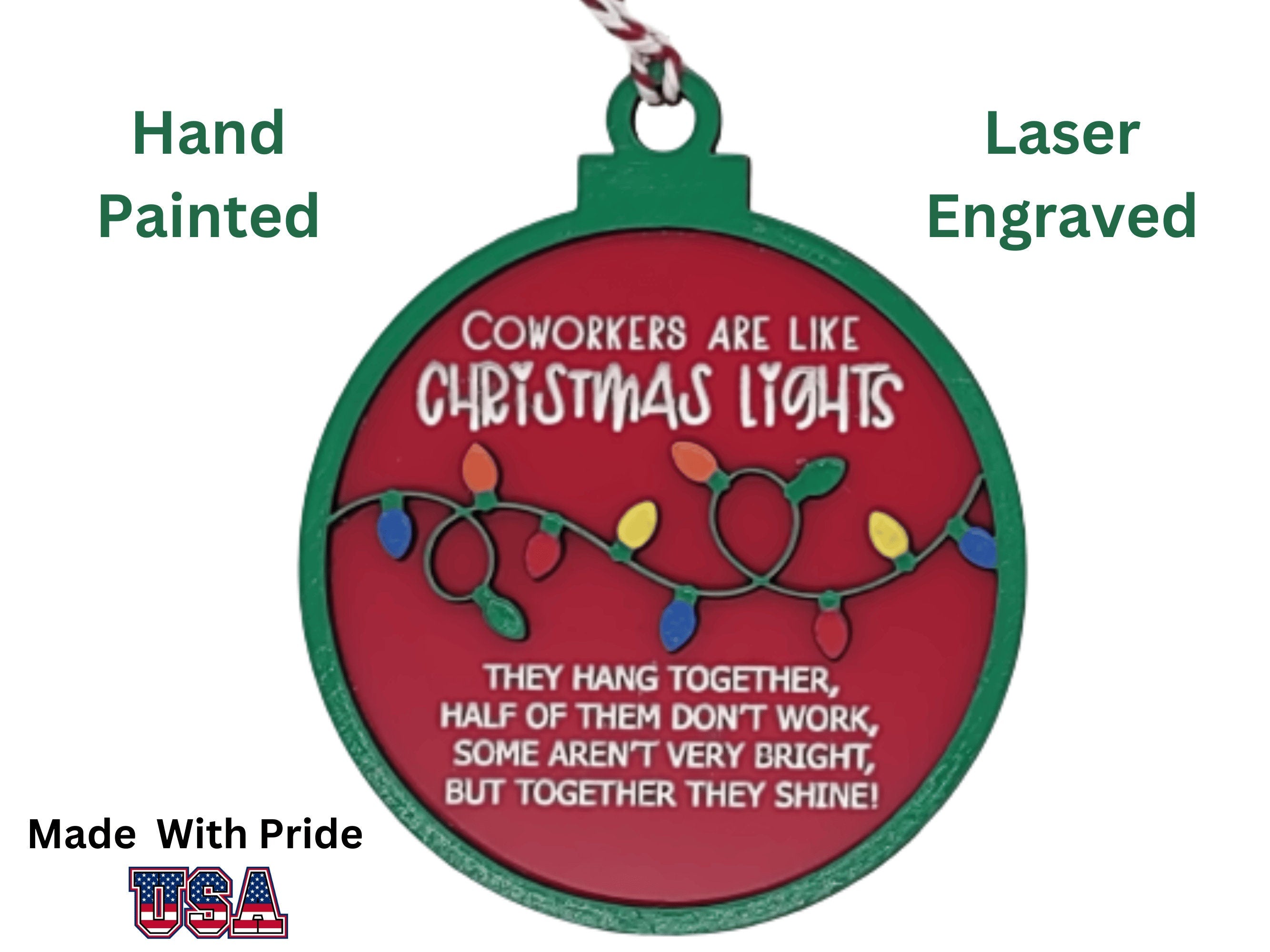 Celebrate the holiday season with our Coworker Holiday Ornament, a perfect and humorous gift idea for Christmas. This ornament is ideal for Secret Santa exchanges, bringing laughter to your workplace festivities. The multi-layer construction adds depth to the design, featuring a vivid hand-painted holiday lights motif and a laser-engraved funny message.