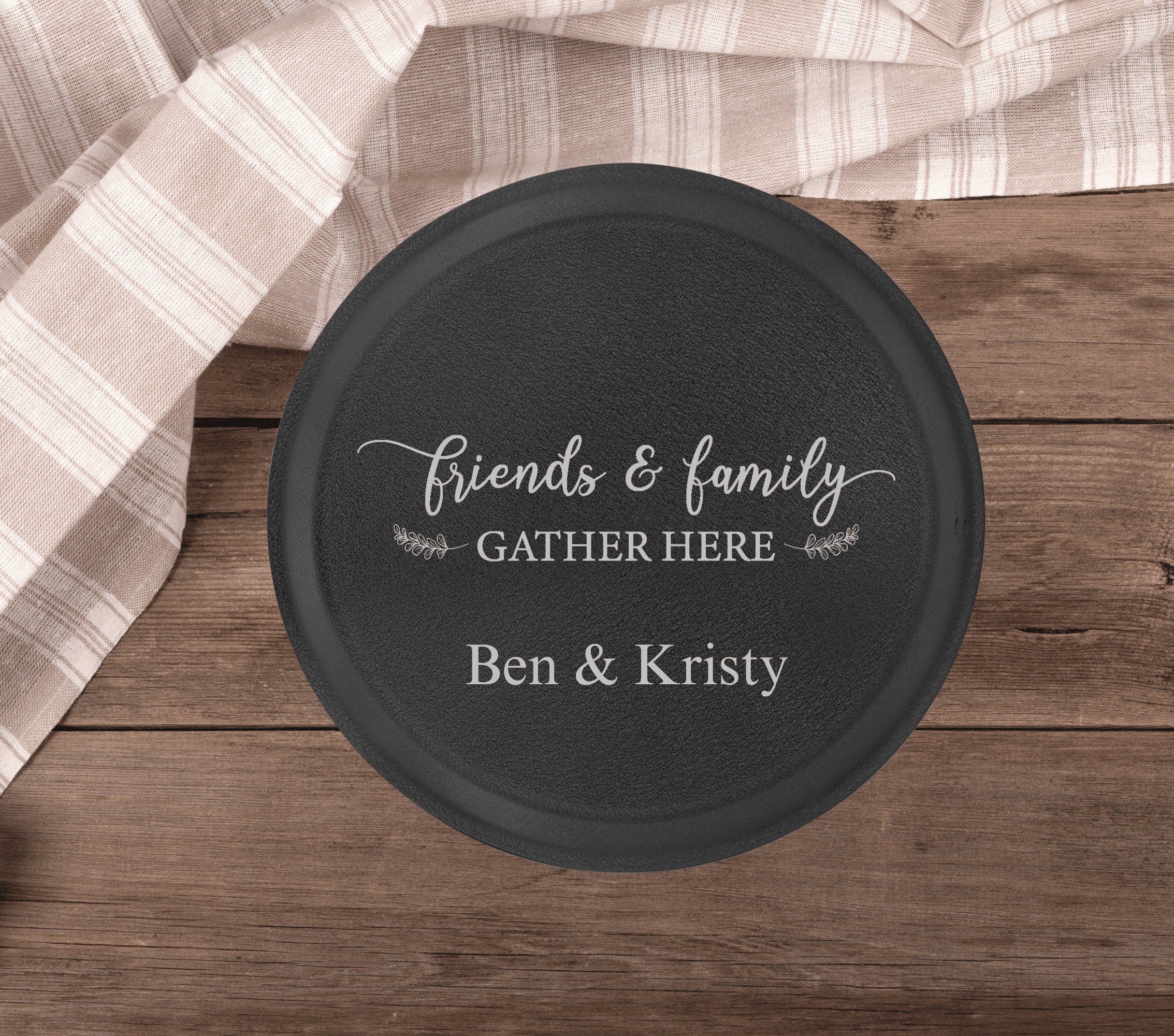 Pie Tin Dimensions: The aluminum pie tin measures 9" round x 1.5" deep and comes with a powder-coated laser engraved lid.