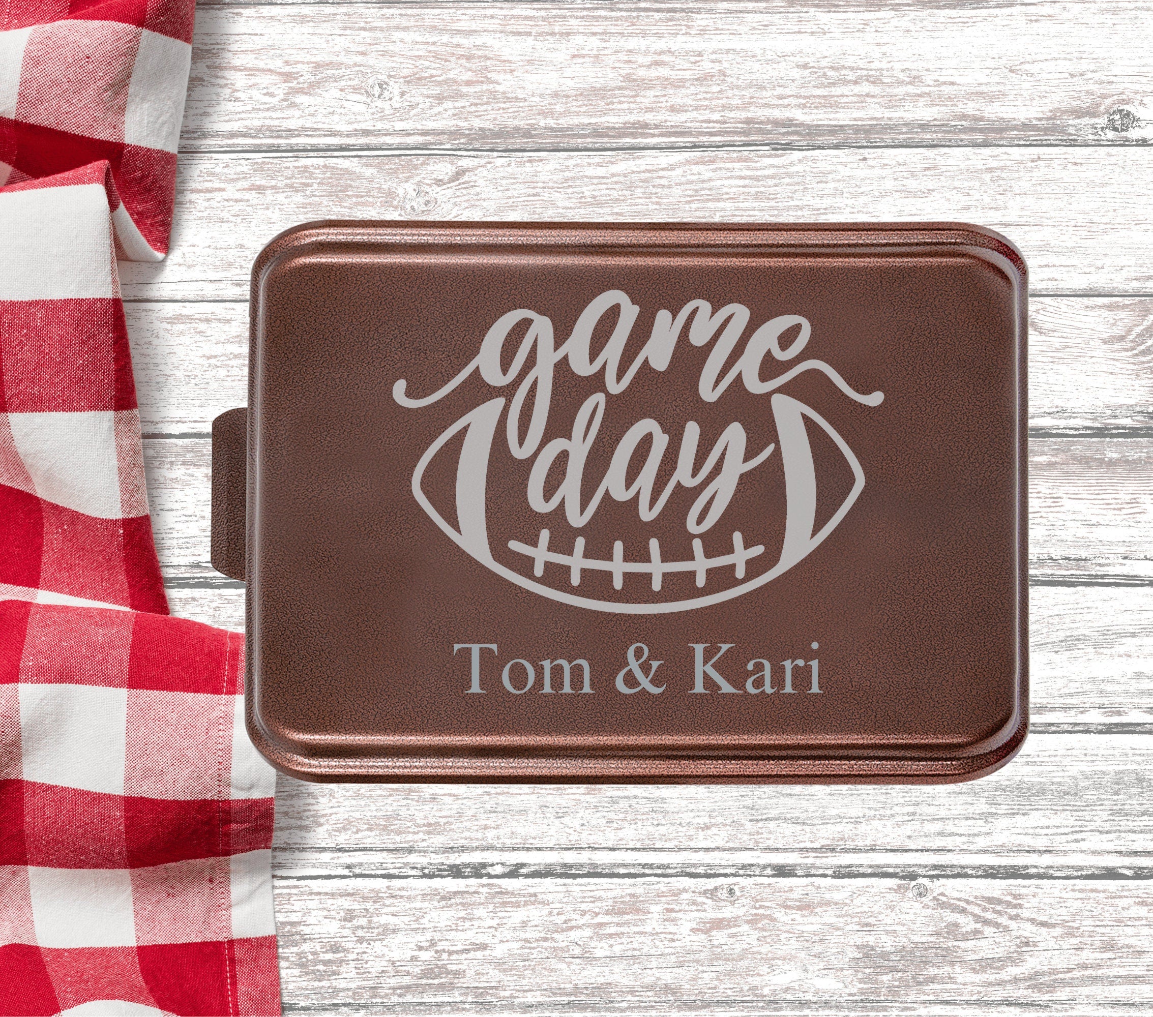 Cake Pan Dimensions: The aluminum cake pan measures 13" x 9" x 2.5" and comes with a powder-coated laser engraved lid.