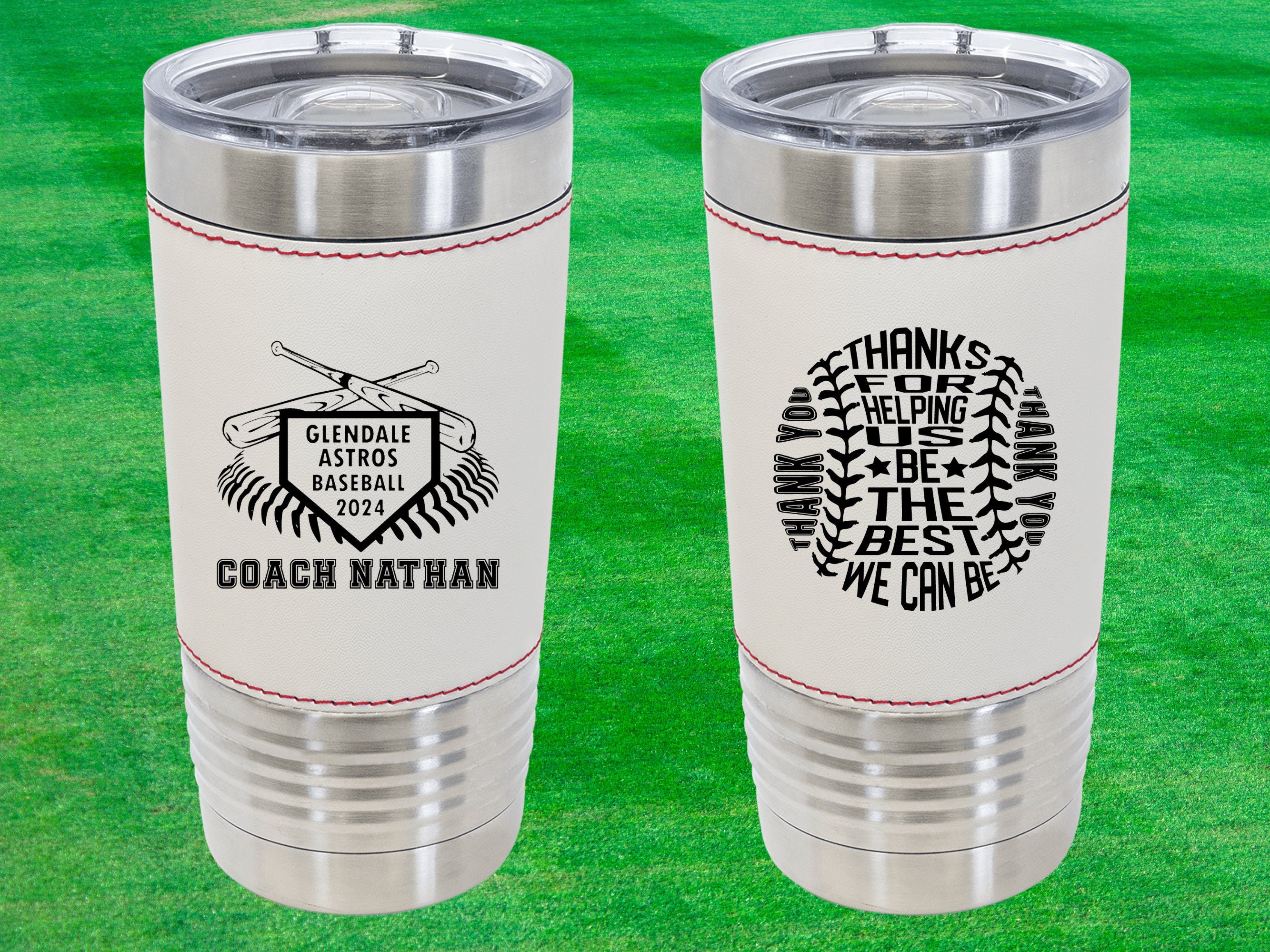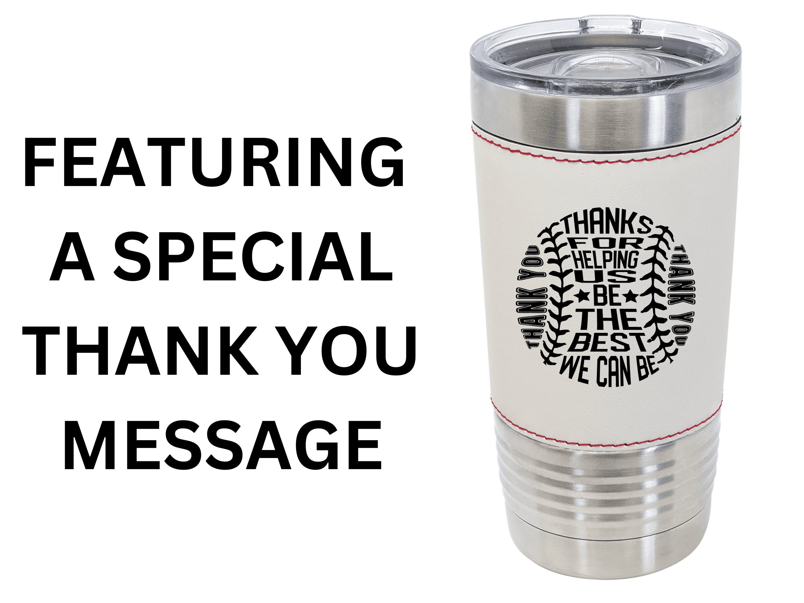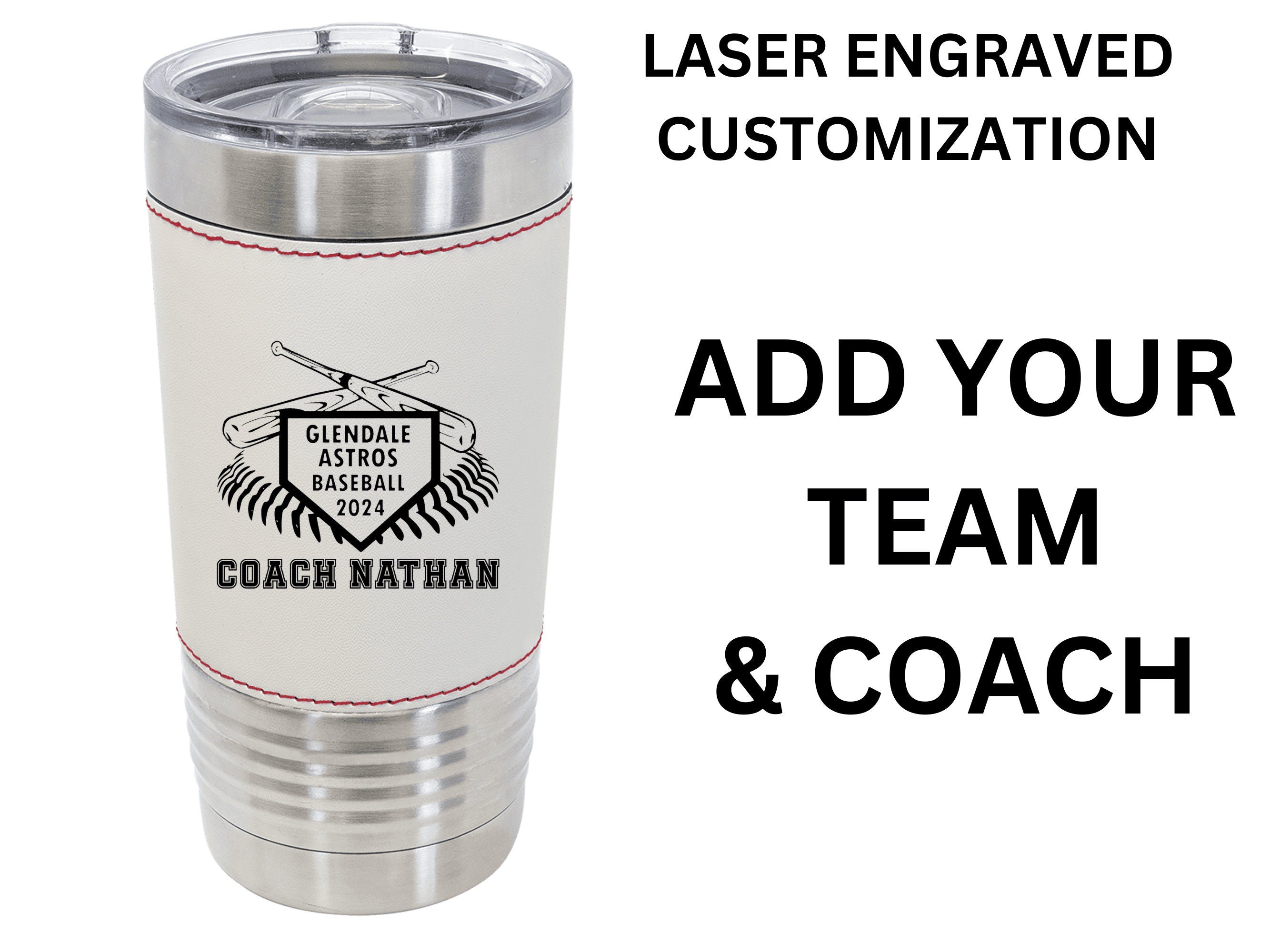 Elevate your baseball league or school team celebrations with our unique 20 oz. leatherette tumbler – an exceptional award or personalized gift for the true fans. This custom tumbler is a standout choice, laser engraved with your team and coach name on the front and a special thank you message on the back, adding a touch of personalization to every sip.