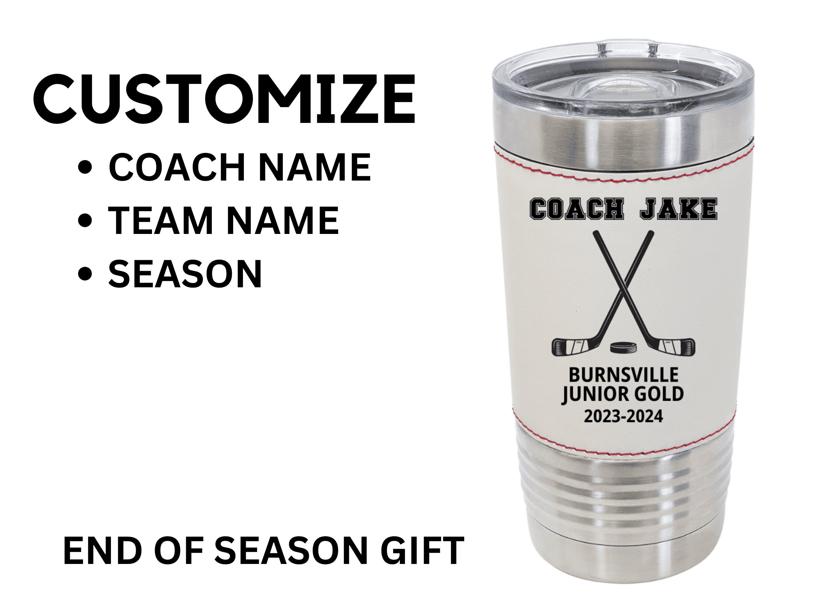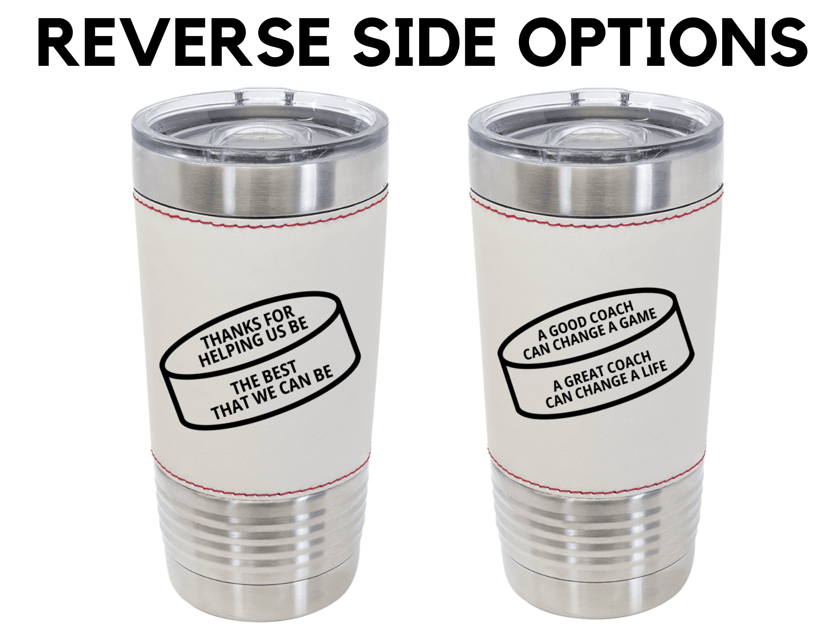 Elevate your hockey league or school team celebrations with our unique 20 oz. leatherette tumbler – an exceptional award or personalized gift for the true fans. This custom tumbler is a standout choice, laser engraved with your team and coach name on the front and a special thank you message on the back, adding a touch of personalization to every sip.
