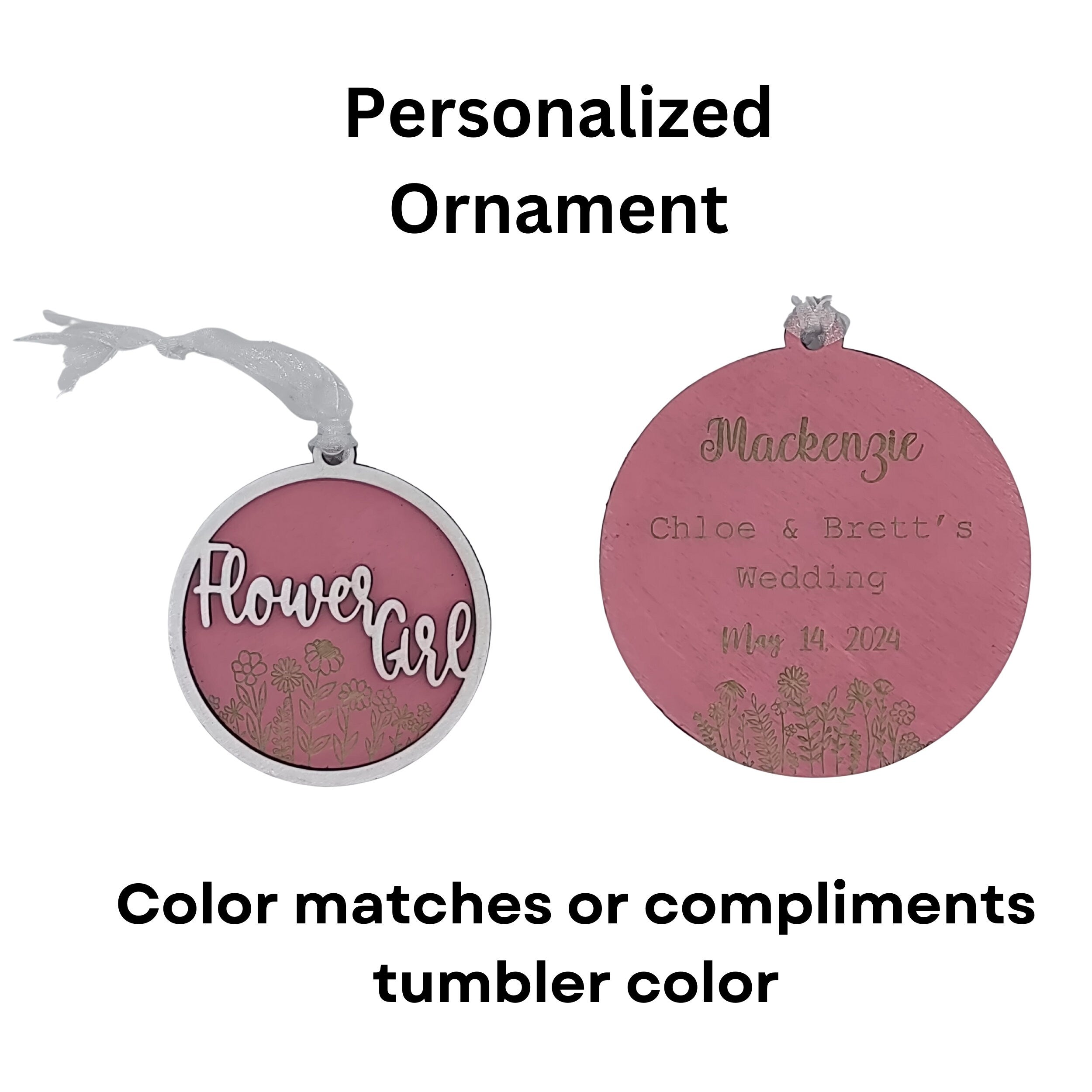 Handmade Wood Ornament: This 3.5" diameter ornament is laser cut and engraved from Baltic Birch. The ornament is personalized with your wedding details on the back and comes with a decorative ribbon for hanging. The ornament's color will match or complement the tumbler color selection.
