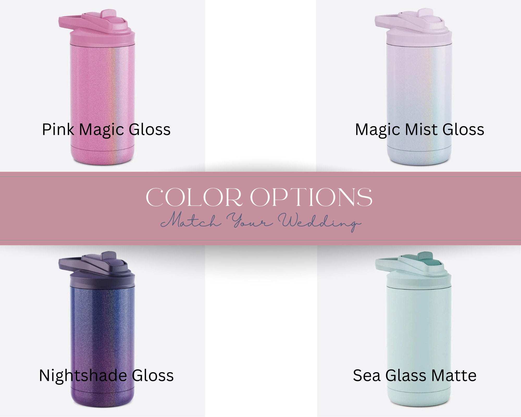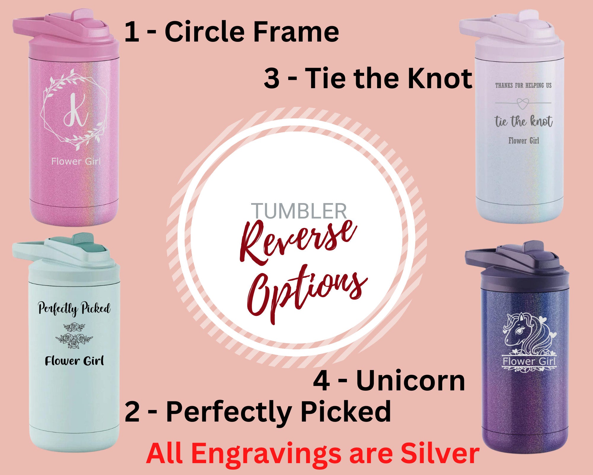 Stainless Steel Water Bottle: Our gift set includes a Save A Cup brand stainless steel water bottle. You can personalize the design with your flower girl's name on the front, and optional designs can be added to the back. With a 12-ounce capacity, a variety of colors to choose from, and thermal insulation, this bottle keeps beverages cold or hot, making it perfect for young ones on the go.