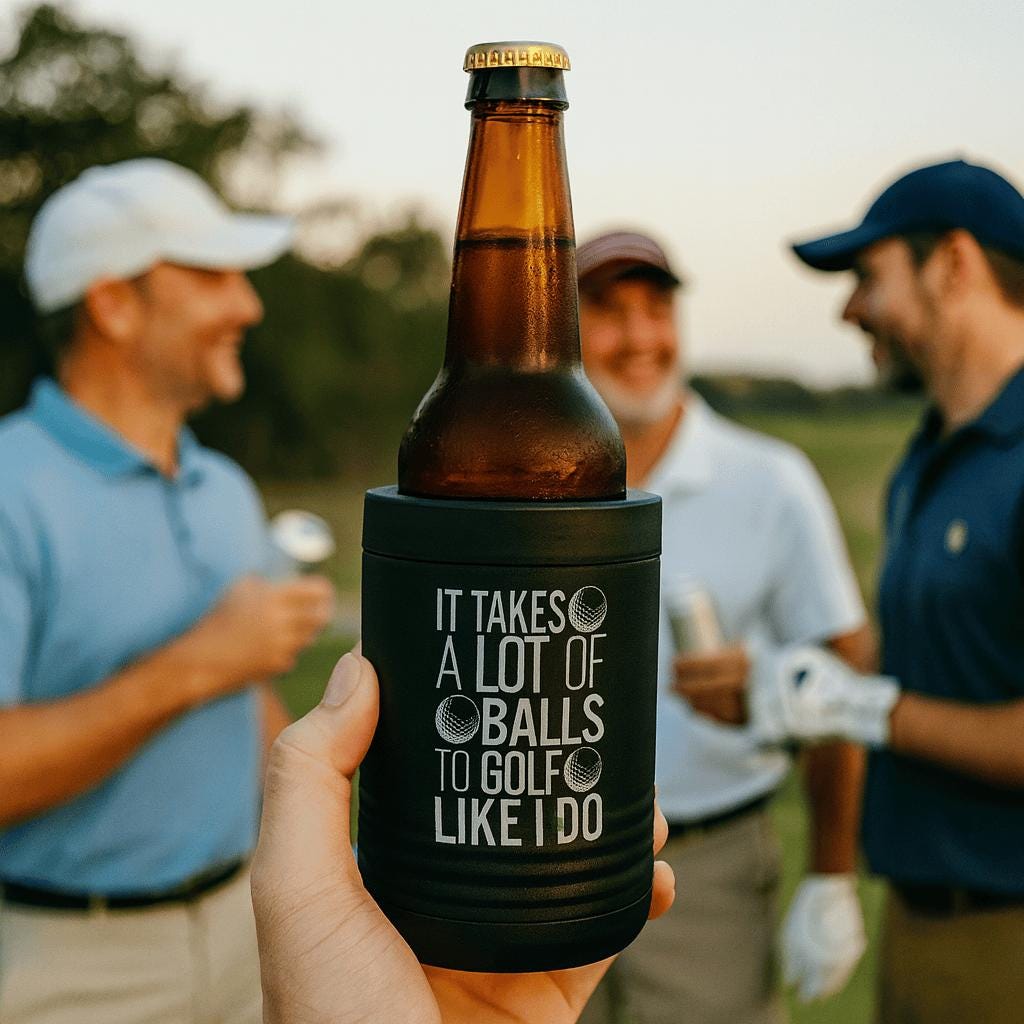 - Customizable Design: This can cooler features the Golf Series with a humorous laser-engraved saying: "It Takes a Lot of Balls to Golf Like I Do." The reverse side showcases a set of golf clubs with an area for personalization, making it a unique gift.