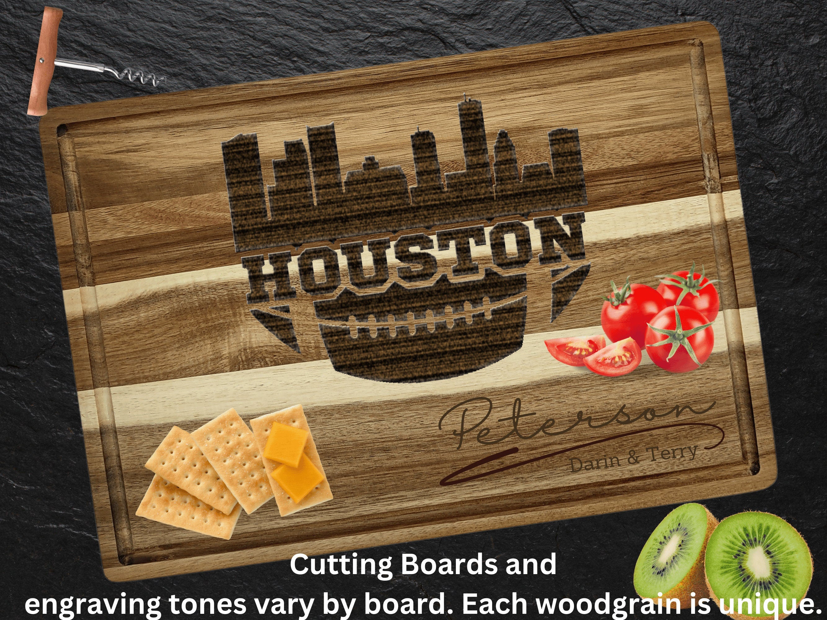 Looking for a thoughtful and unique gift for the Houston football fan in your life? How about that perfect accessory for your Super Bowl party? Our custom cutting boards are the perfect choice! Crafted from sustainable acacia wood, these cutting boards add a touch of elegance to any kitchen. Personalized with precision using our laser engraving process, they make a memorable and functional gift for various occasions.