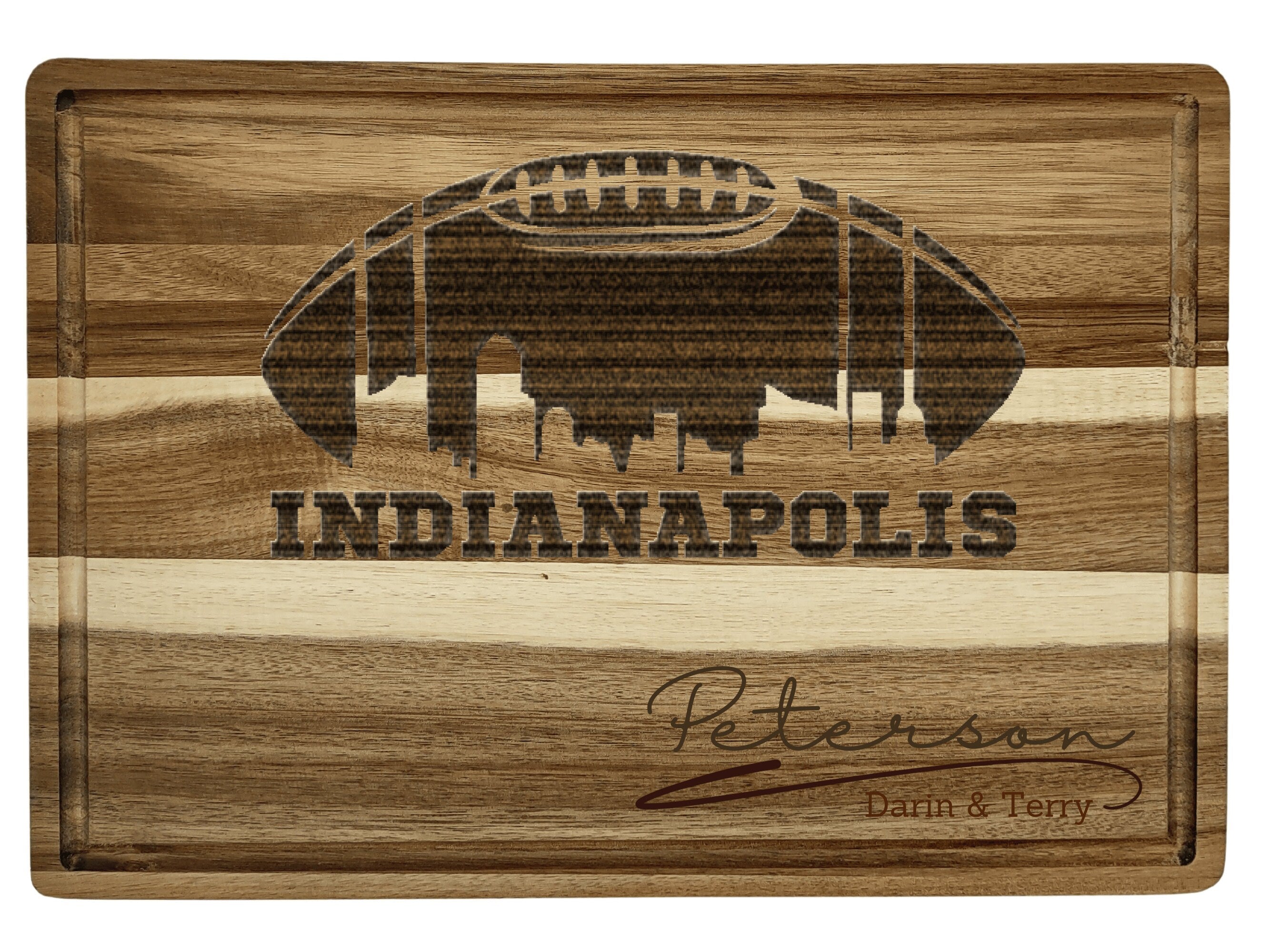Looking for a thoughtful and unique gift for the Indianapolis football fan in your life? How about that perfect accessory for your Super Bowl party? Our custom cutting boards are the perfect choice! Crafted from sustainable acacia wood, these cutting boards add a touch of elegance to any kitchen. Personalized with precision using our laser engraving process, they make a memorable and functional gift for various occasions.