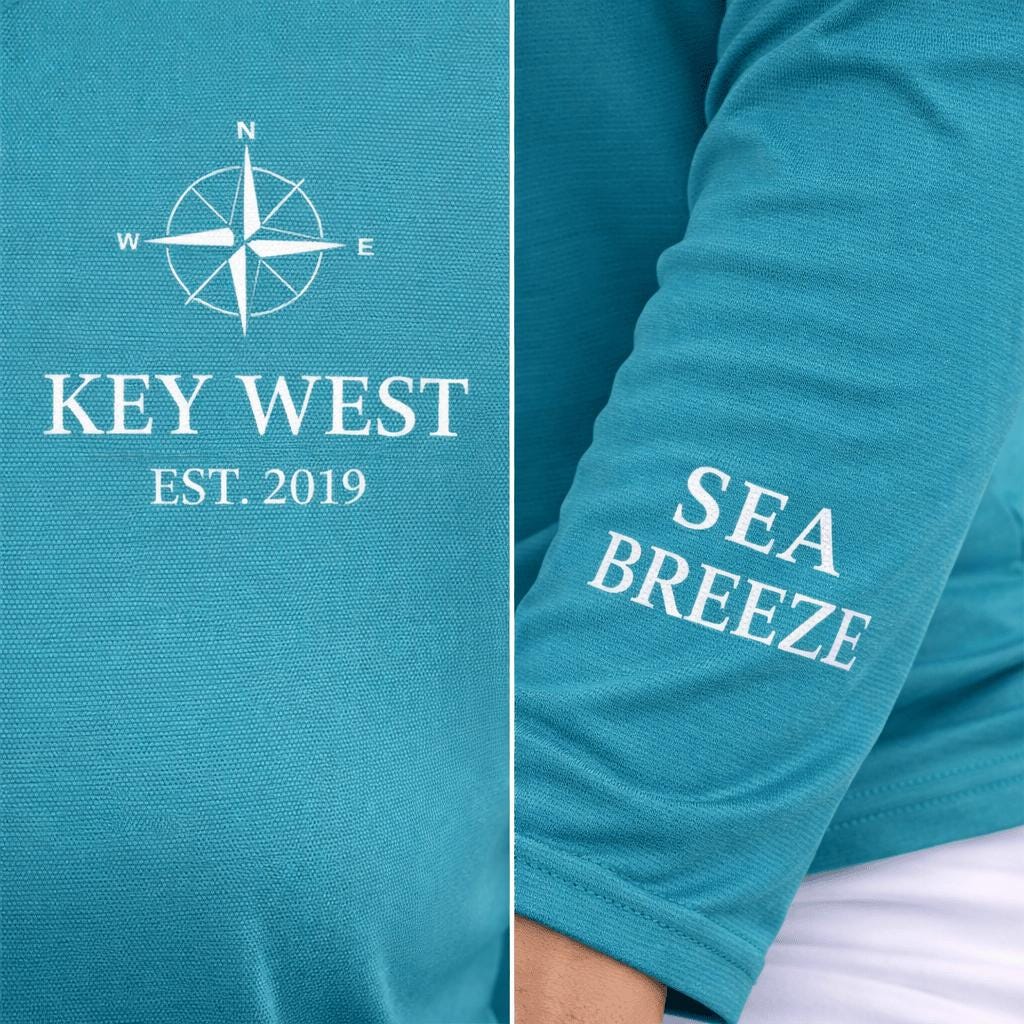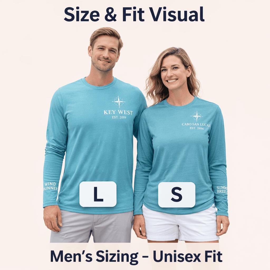 Celebrate your love of the sea with this personalized Key West Sailing Sun Shirt, designed for comfort, performance, and timeless nautical style. This custom long-sleeve UV protection shirt features a classic compass emblem with your chosen port name on the chest and your boat name printed on the sleeve, making it a truly meaningful keepsake for anyone who loves life on the water.