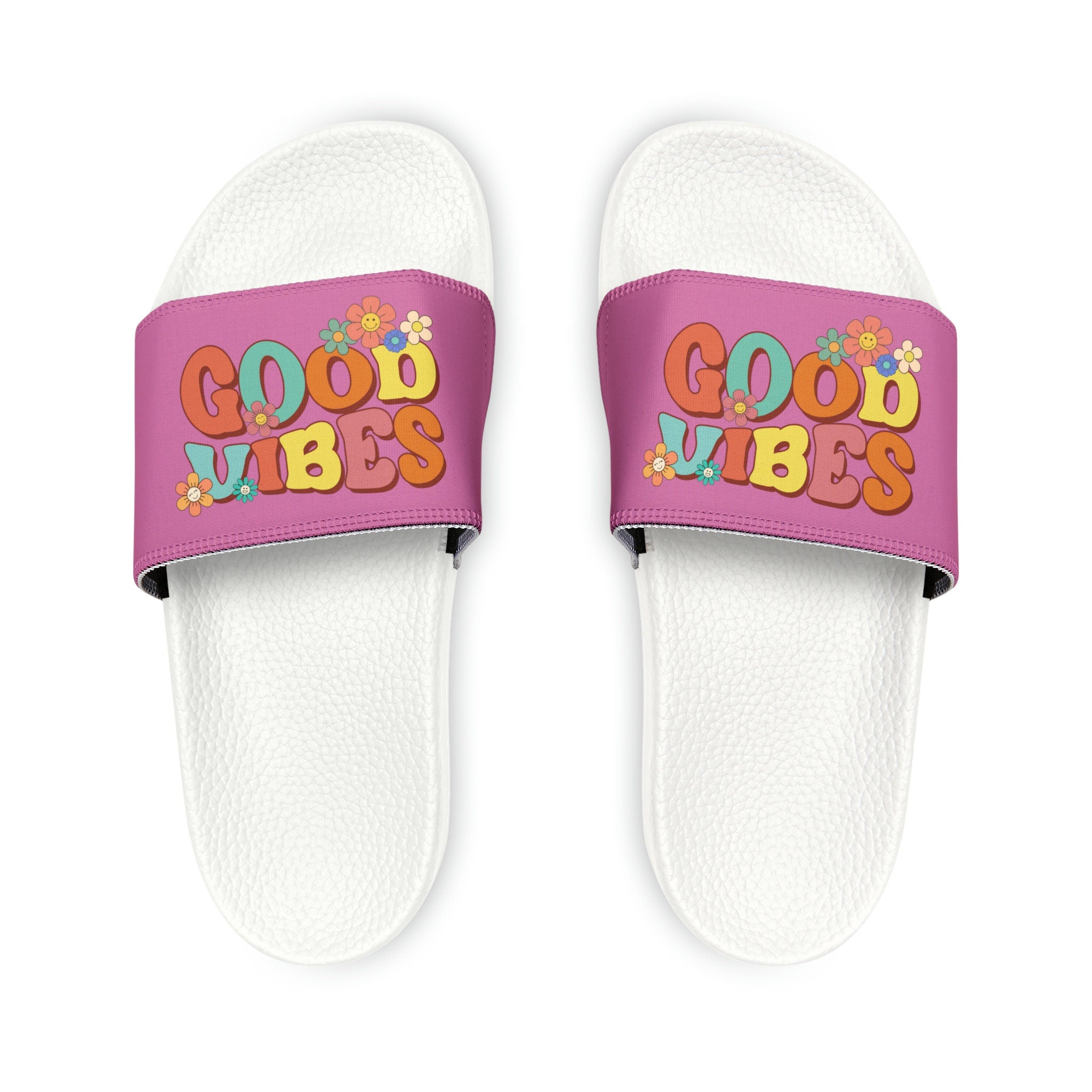 Let your kids take on the summer heat with style in these vibrant and comfortable "Good Vibes" slide sandals. Perfect for beach days, playdates, or simply enjoying the sun.