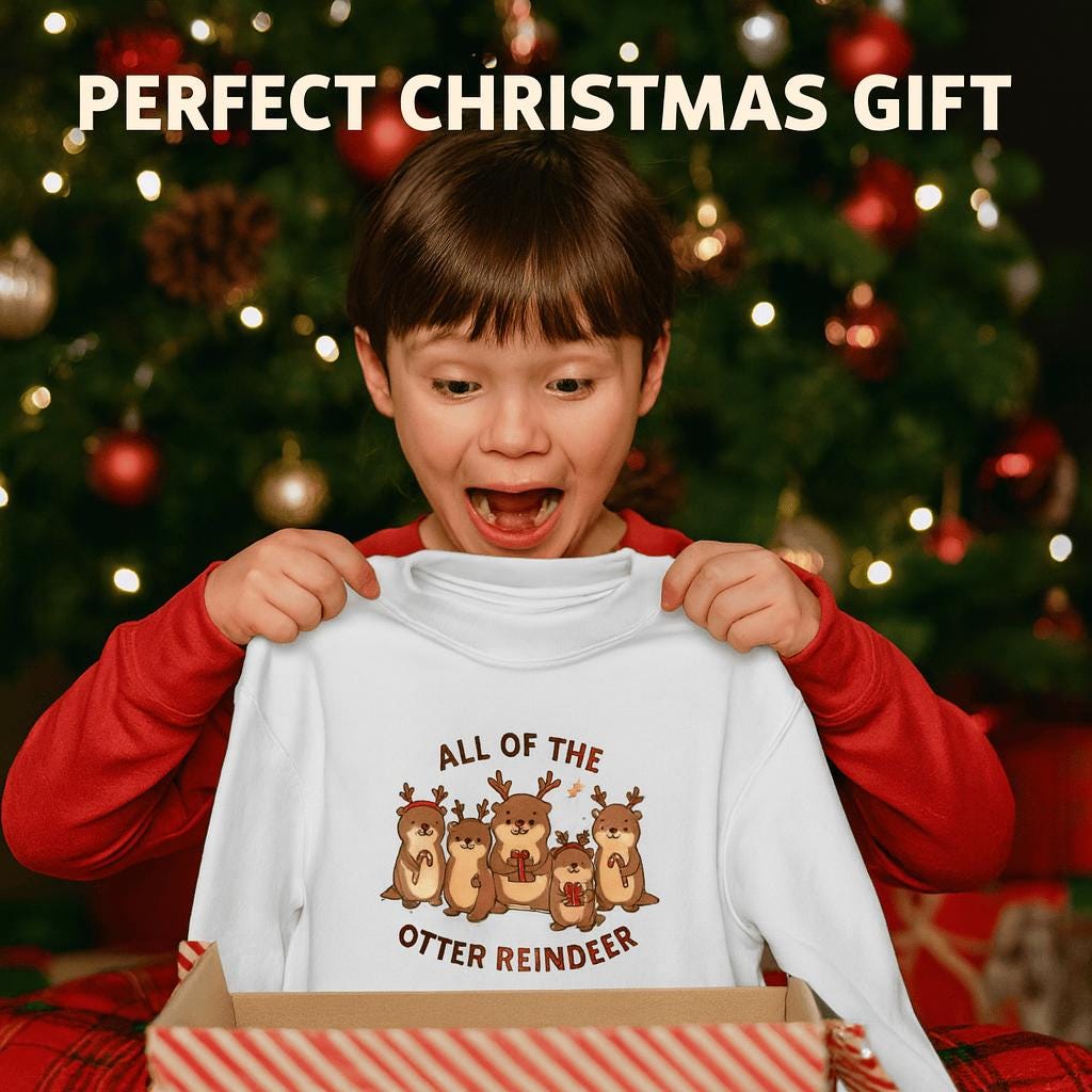 Make this holiday season extra merry with our Kids “All of the Otter Reindeer” Christmas Sweatshirt! Featuring a group of adorable otters dressed as festive reindeer, this cozy sweatshirt is guaranteed to bring smiles, laughter, and holiday cheer. Perfect for holiday parties, school events, Christmas morning, or just staying warm in style.