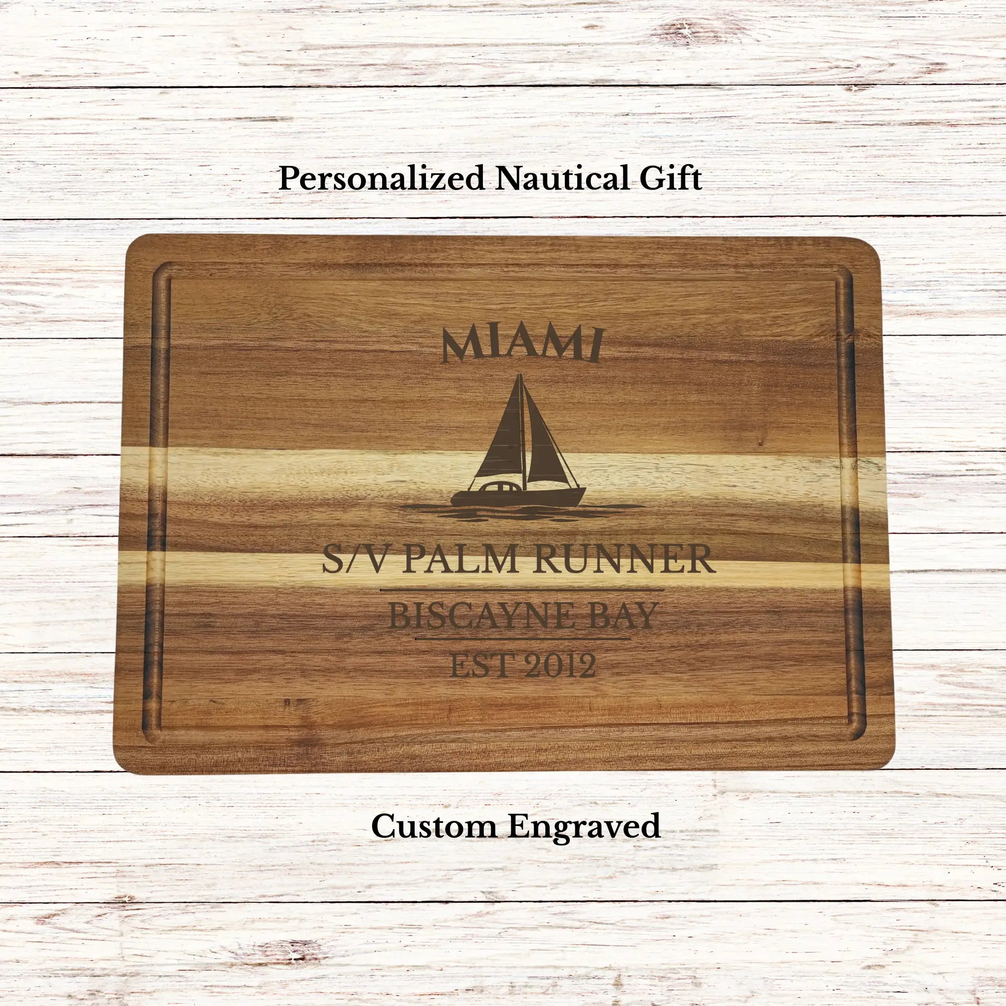 Bring the vibrant coastal sailing lifestyle of Miami into your galley with a personalized sailboat cutting board, custom engraved with your boat name or family name and established year. Located along the southeastern coast of Florida, Miami is a world-renowned boating destination where turquoise waters, steady ocean breezes, and access to the Caribbean create an unmatched sailing experience.