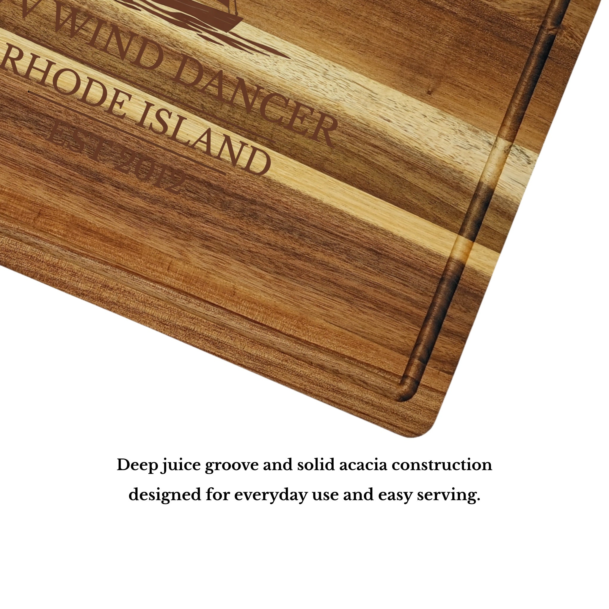Crafted from thick 1" solid acacia wood (never veneer) with rich natural grain and a deep juice groove — built for real, everyday use on land or sea.