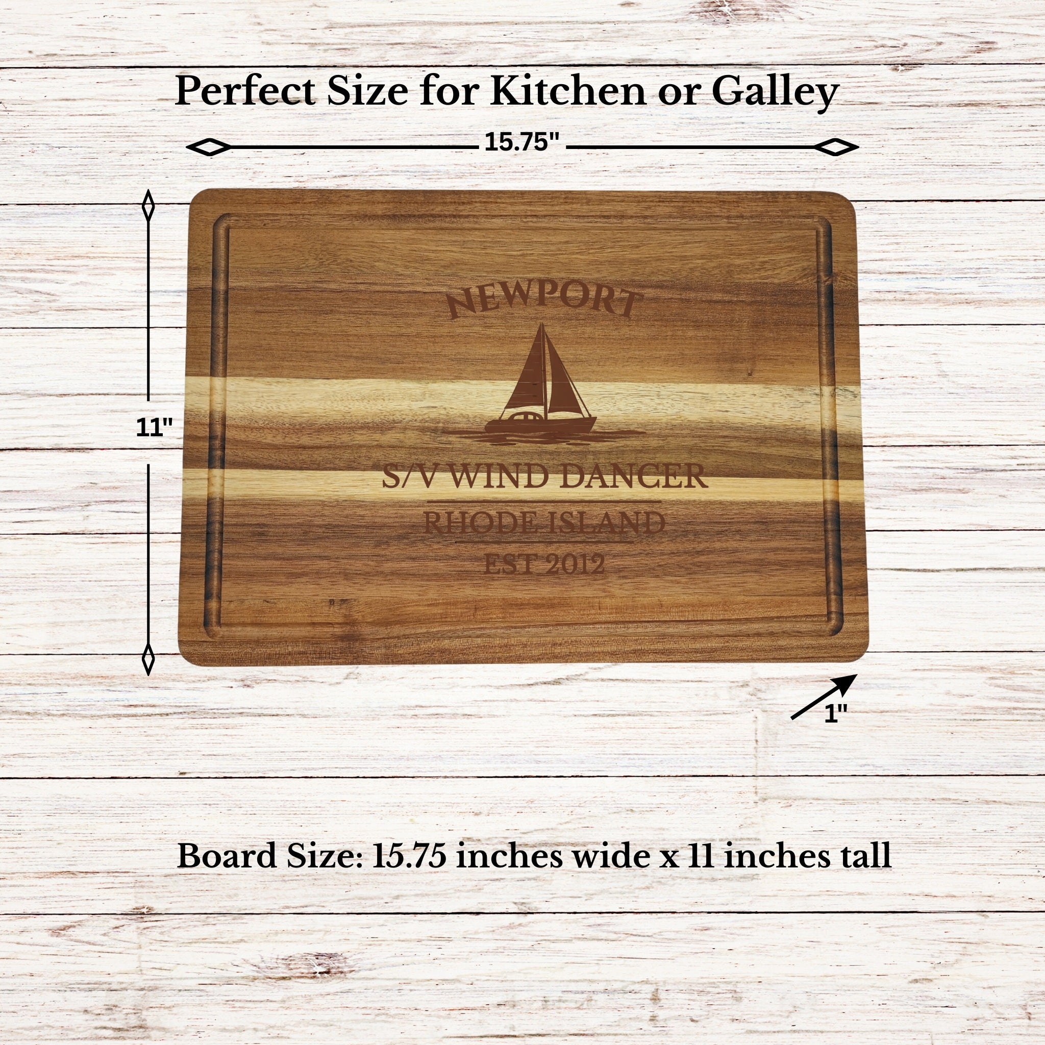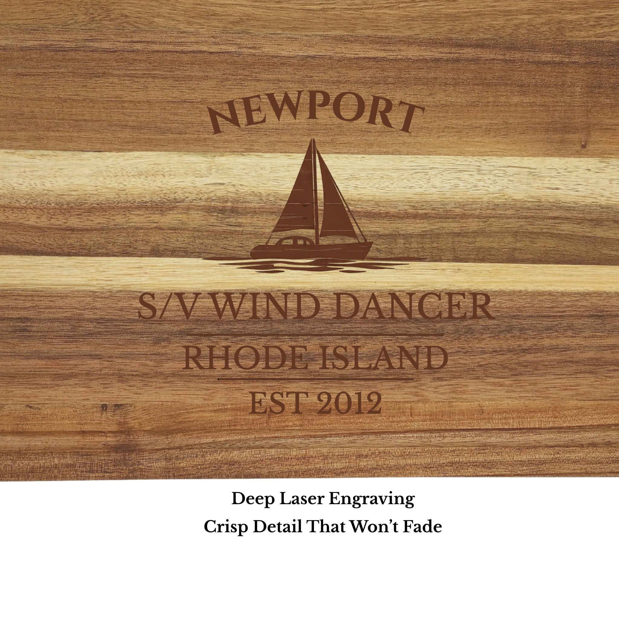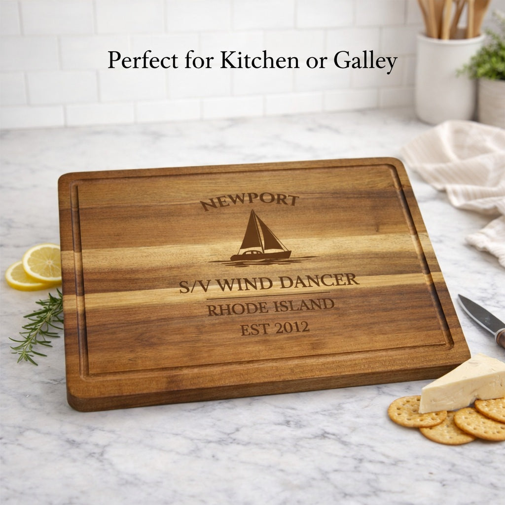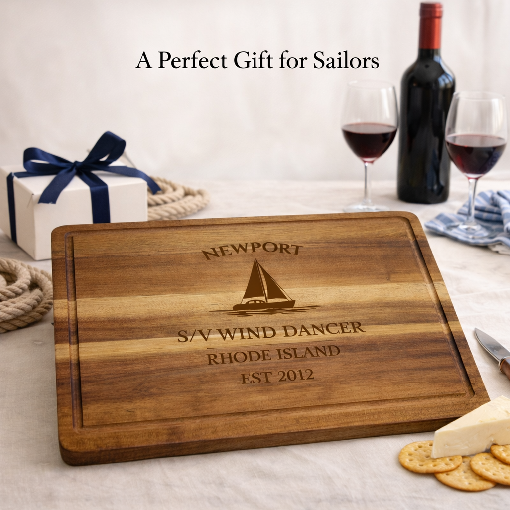 Bring the legendary sailing heritage of Newport Harbor into your galley with a personalized sailboat cutting board, custom engraved with your boat name or family name and established year. Known around the world for its historic regattas and deep maritime tradition, Newport has long been a gathering place for sailors, yacht clubs, and ocean lovers — making this board a meaningful tribute to one of America’s most iconic sailing harbors.