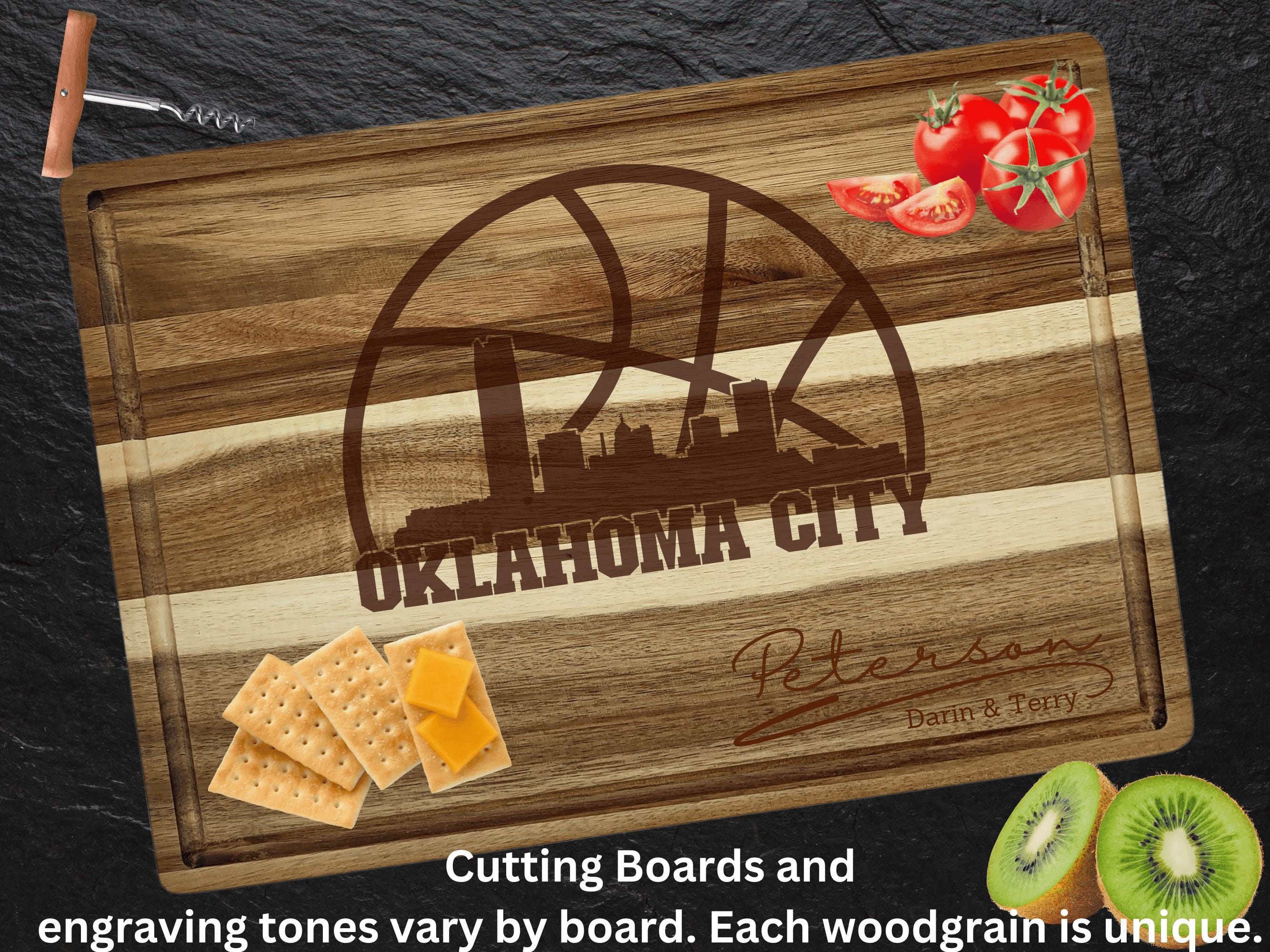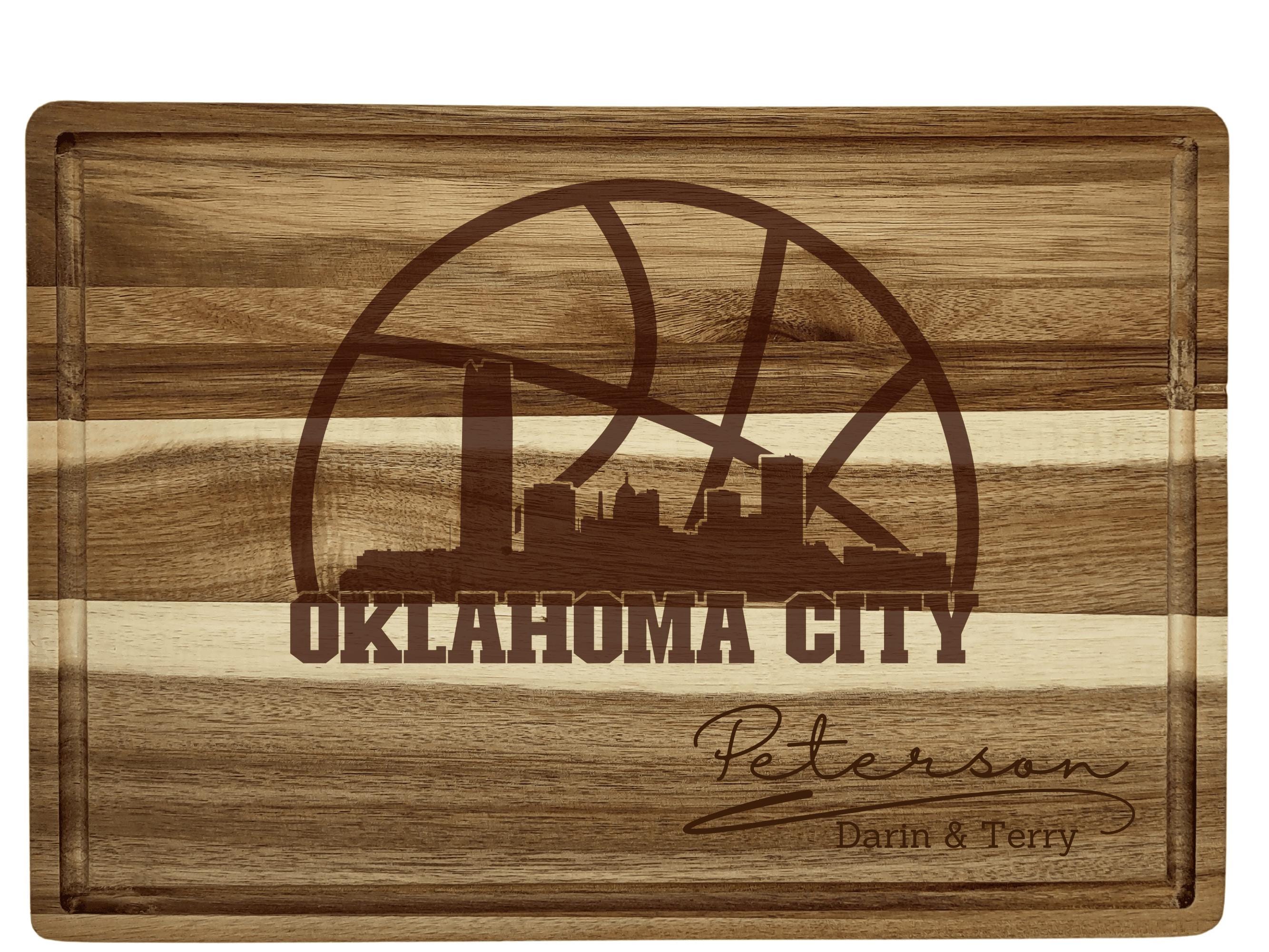 Looking for a thoughtful and unique gift for the Oklahoma Basketball fan in your life? How about that perfect accessory for your hoops party? Our custom cutting boards are the perfect choice! Crafted from sustainable acacia wood, these cutting boards add a touch of elegance to any kitchen. Personalized with precision using our laser engraving process, they make a memorable and functional gift for various occasions.