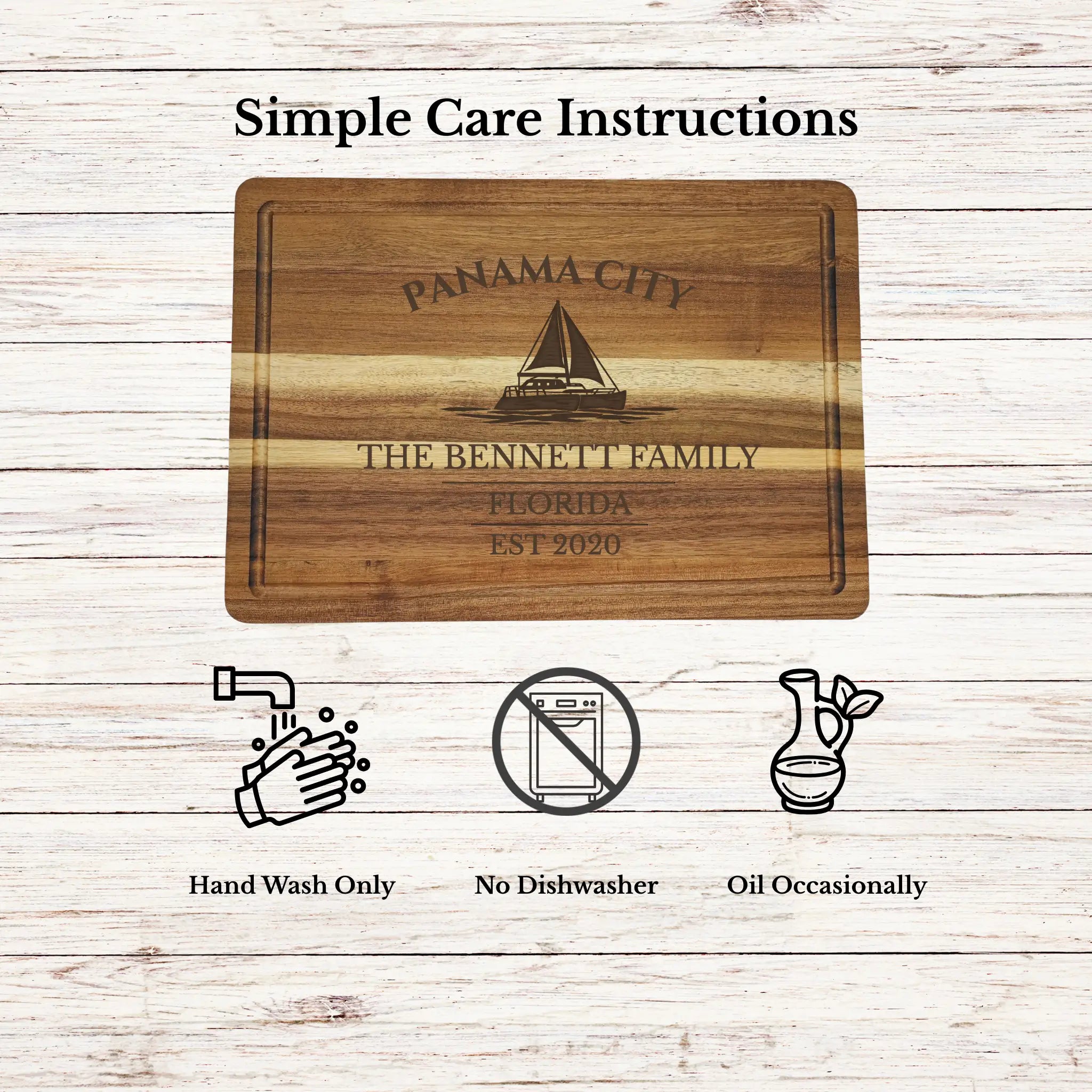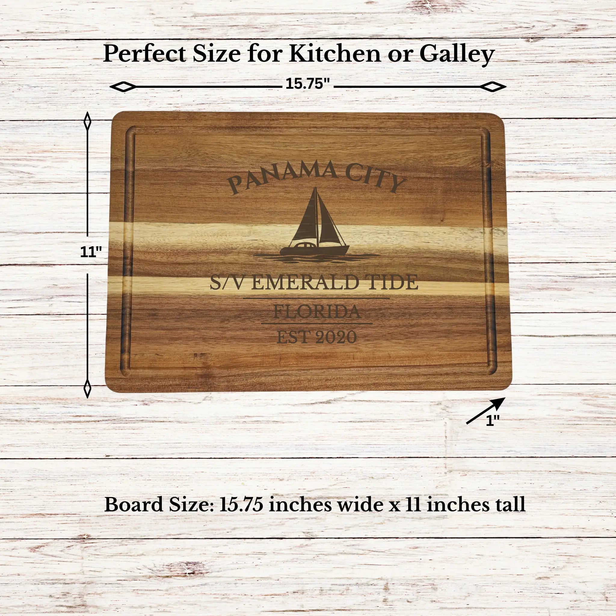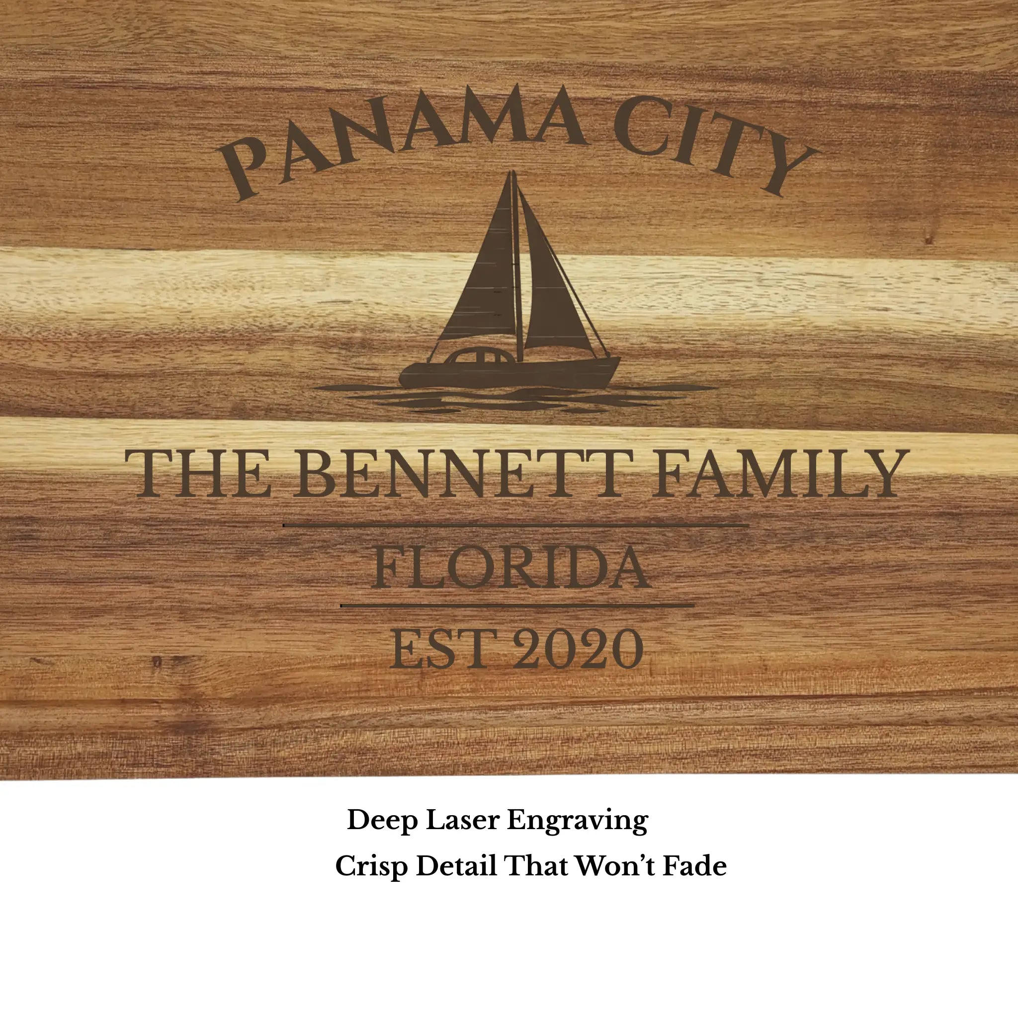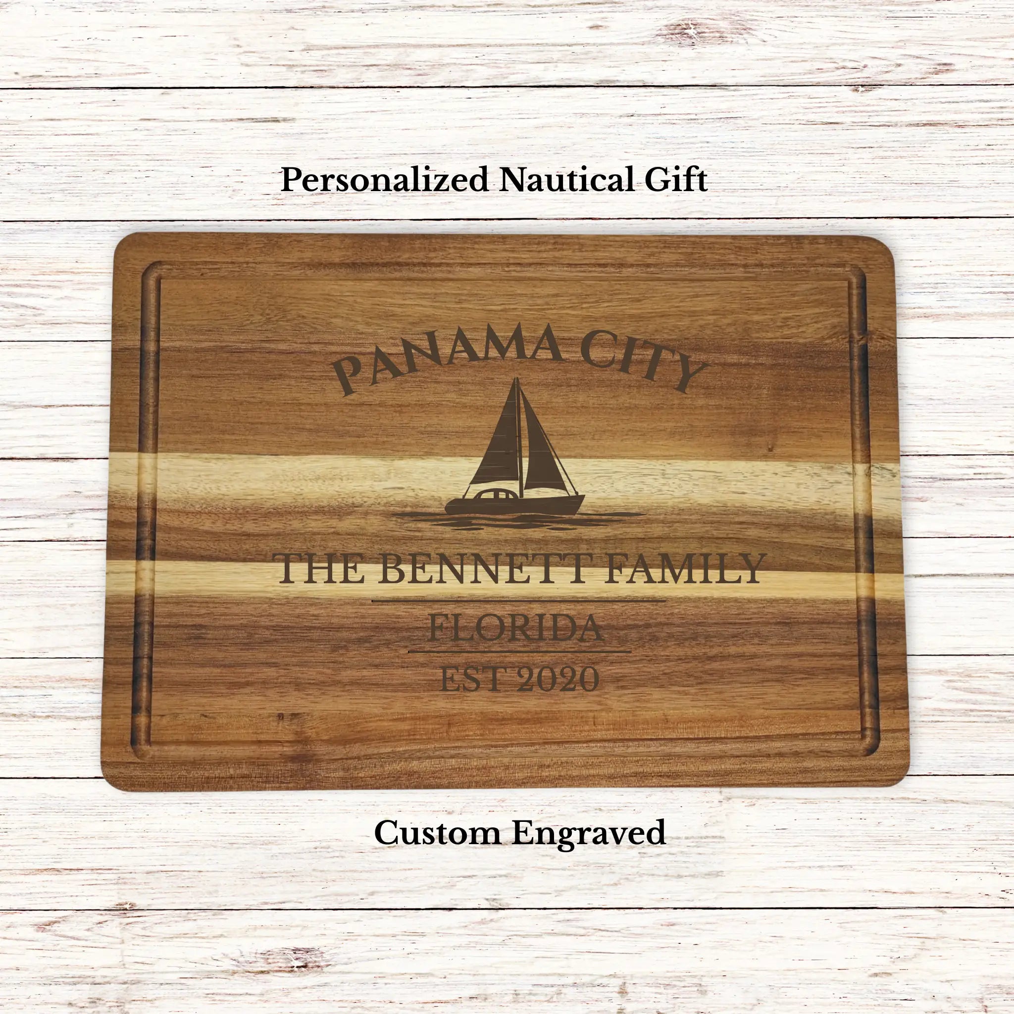 Bring the relaxed coastal lifestyle of Panama City into your home with a personalized cutting board gift, custom engraved with your boat name or family name and established year. Located along Florida’s Emerald Coast, Panama City offers a perfect blend of protected bay sailing and open Gulf access.