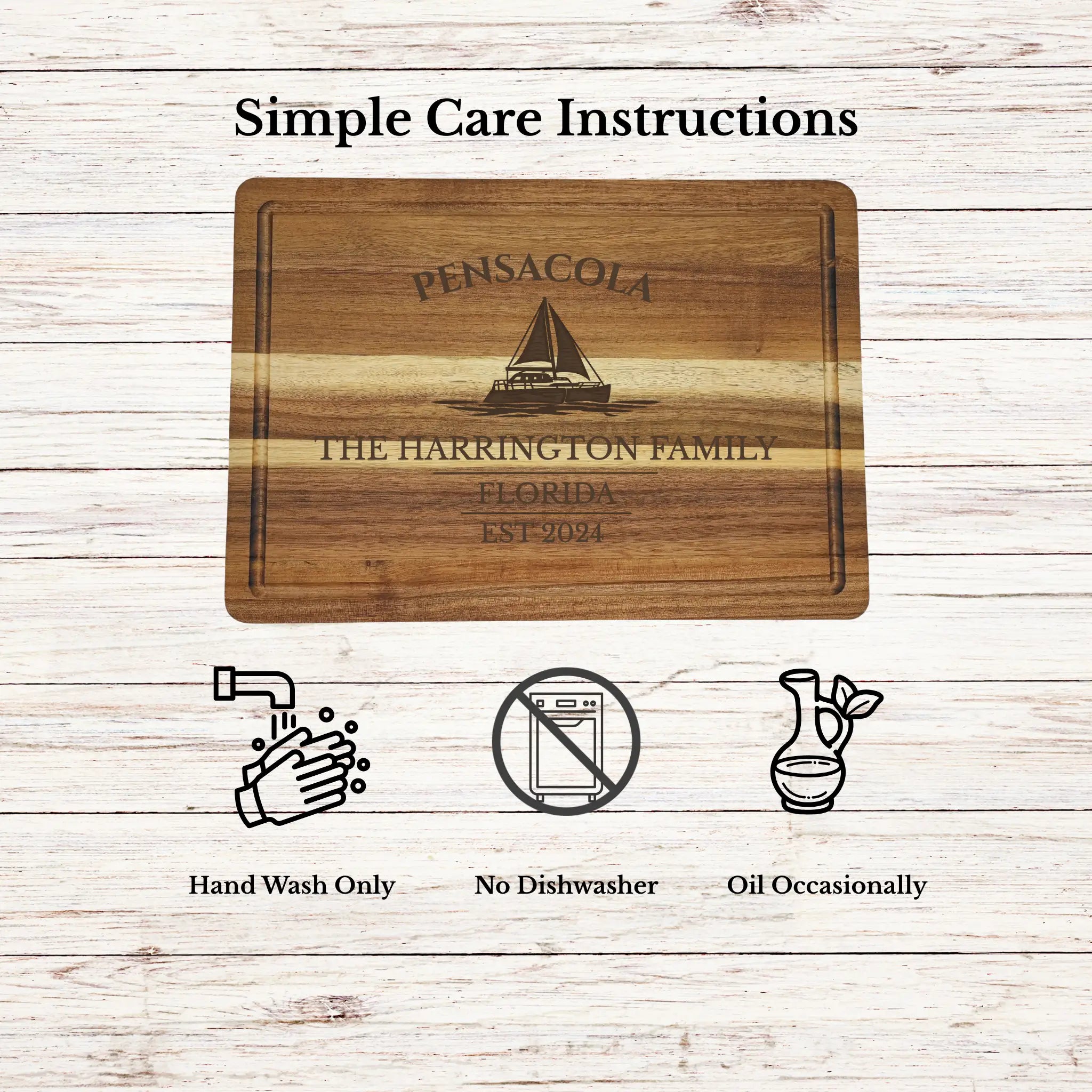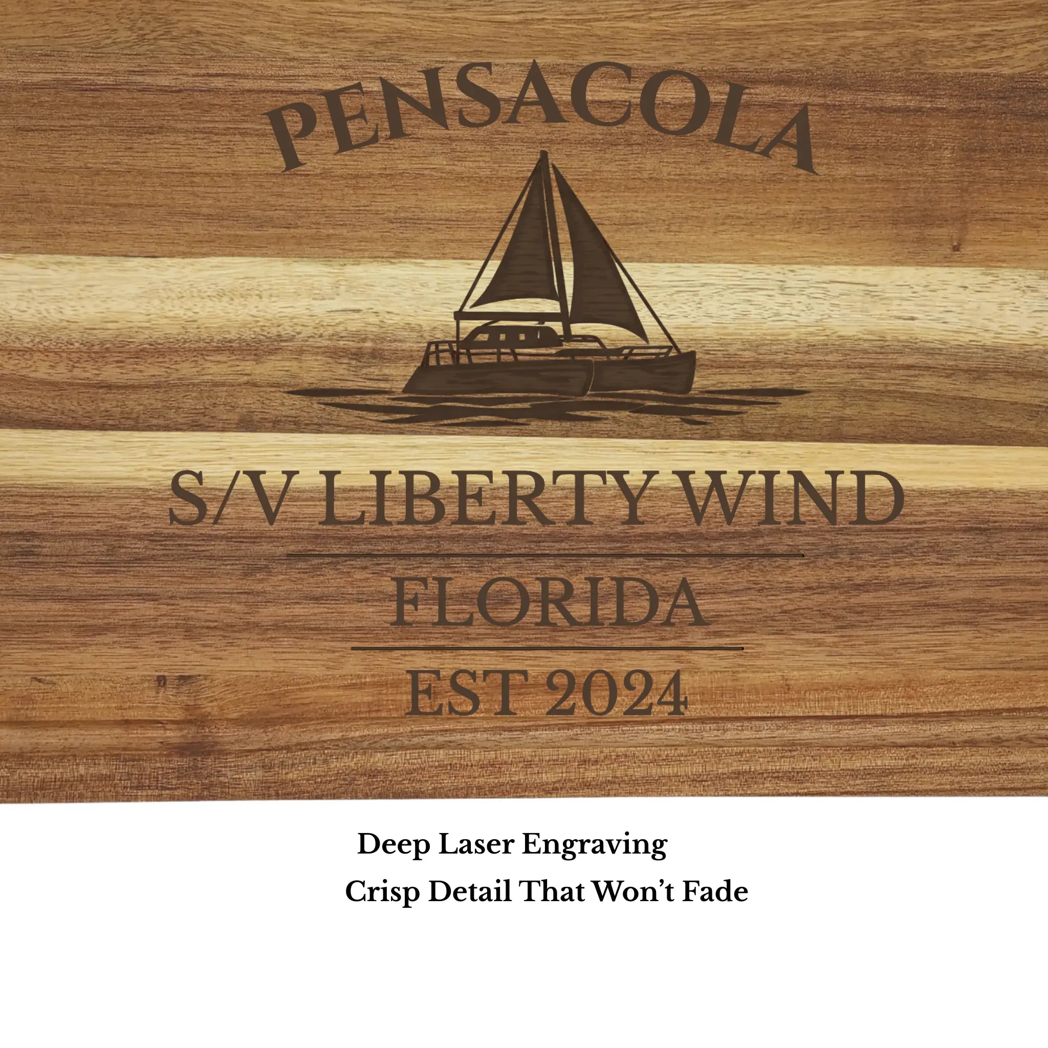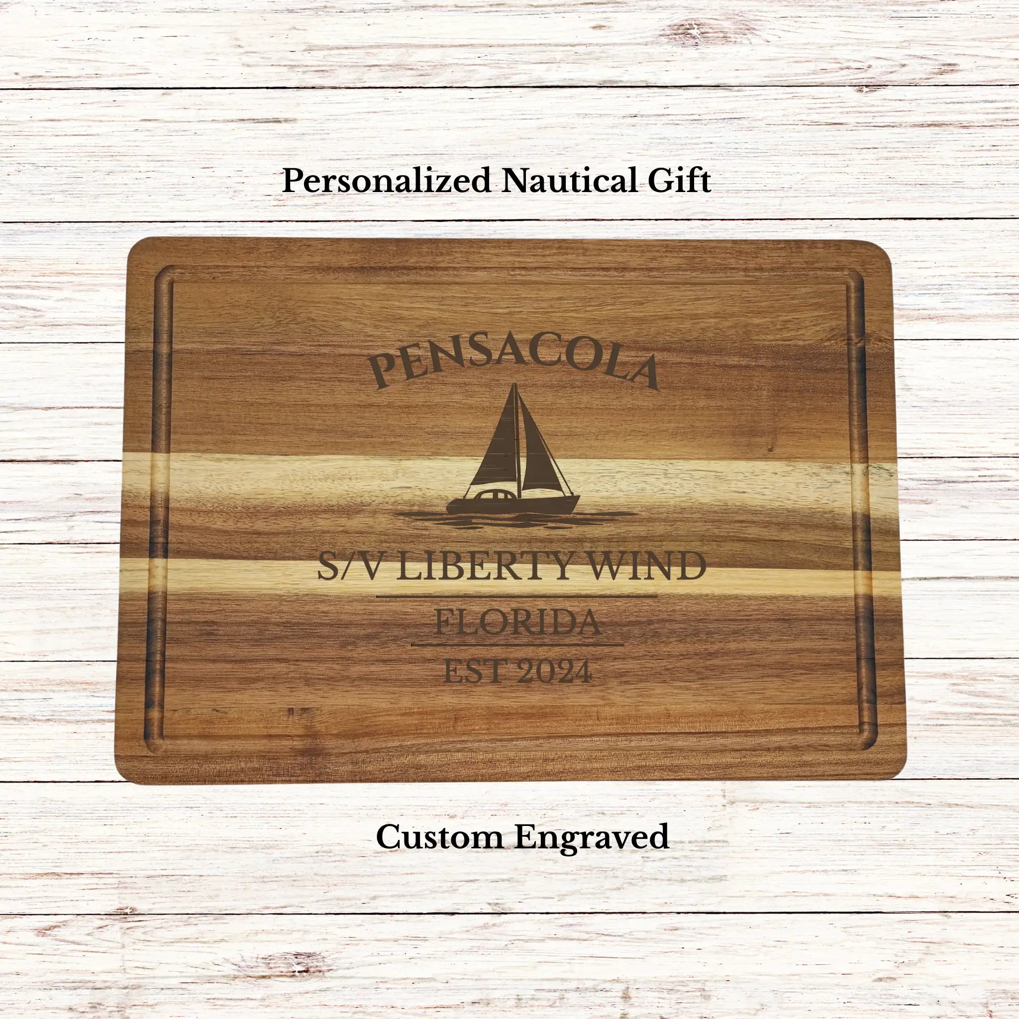 Bring the deep-rooted maritime heritage of Pensacola into your home with a personalized cutting board gift, custom engraved with your boat name or family name and established year. Known as one of the oldest European settlements in the United States, Pensacola blends rich naval history with a strong Gulf Coast boating culture.