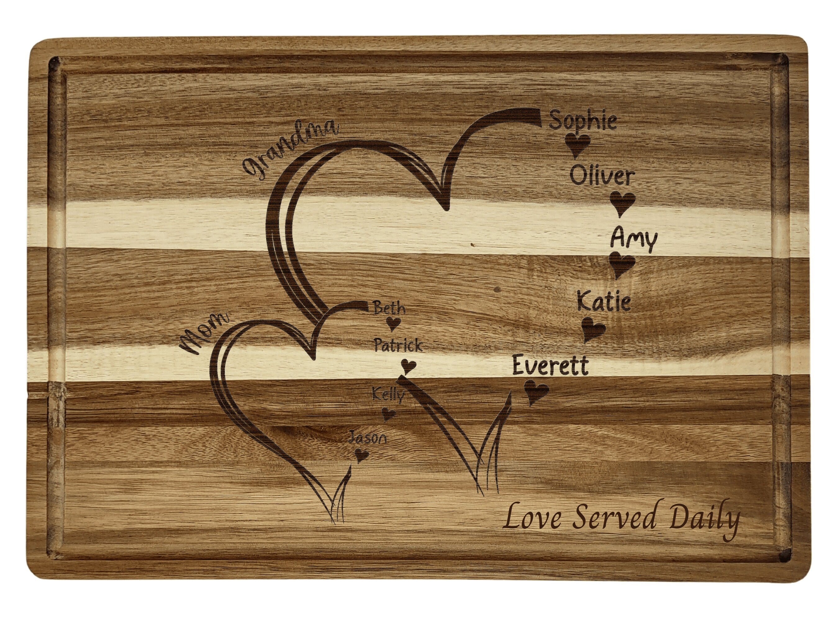 Looking for a thoughtful and unique gift for a mom or grandmother?? Our custom cutting boards are the perfect choice! Crafted from sustainable acacia wood, these cutting boards add a touch of elegance to any kitchen. Personalized with precision using our laser engraving process, they make a memorable and functional gift for various occasions. This design features heart patterns with the kids and grandchildren's names.