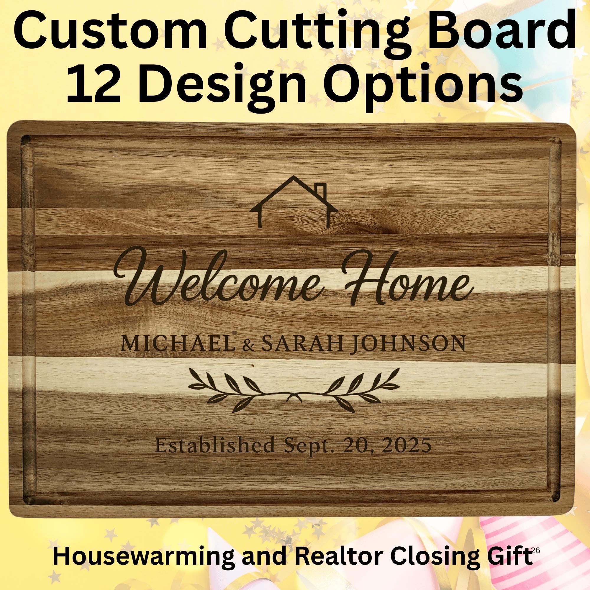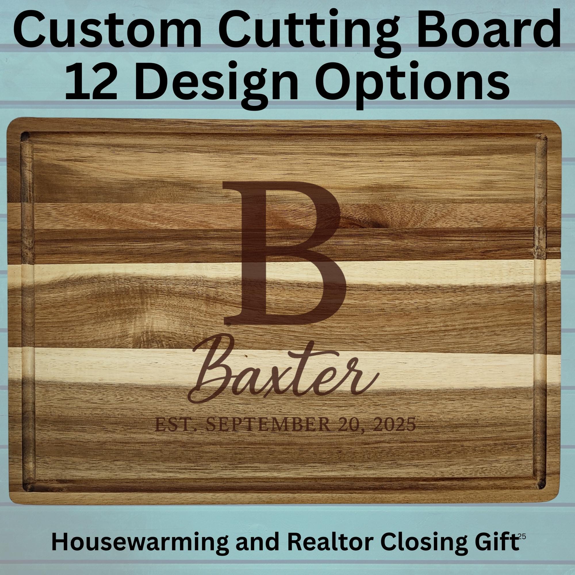 Whether it’s used for meal prep, serving charcuterie, or displayed as décor, this cutting board is sure to impress. Add names, dates, or a personalized message on the front – and for Realtors, an optional thank-you note can be engraved on the back to leave a lasting impression.