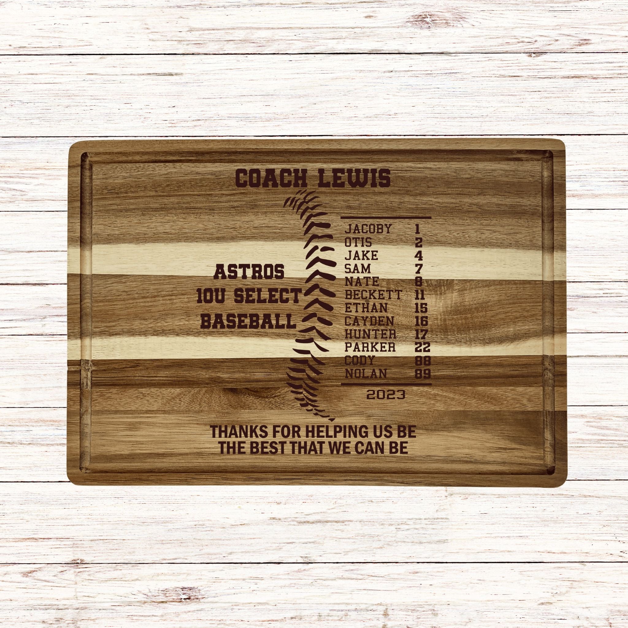 Looking for a thoughtful and unique gift for that special baseball or softball coach? Our custom cutting boards are the perfect choice! Crafted from sustainable acacia wood, these cutting boards add a touch of elegance to any kitchen. Personalized with precision using our laser engraving process, they make a memorable and functional gift and the perfect way to say "Thank You" for a memorable season.