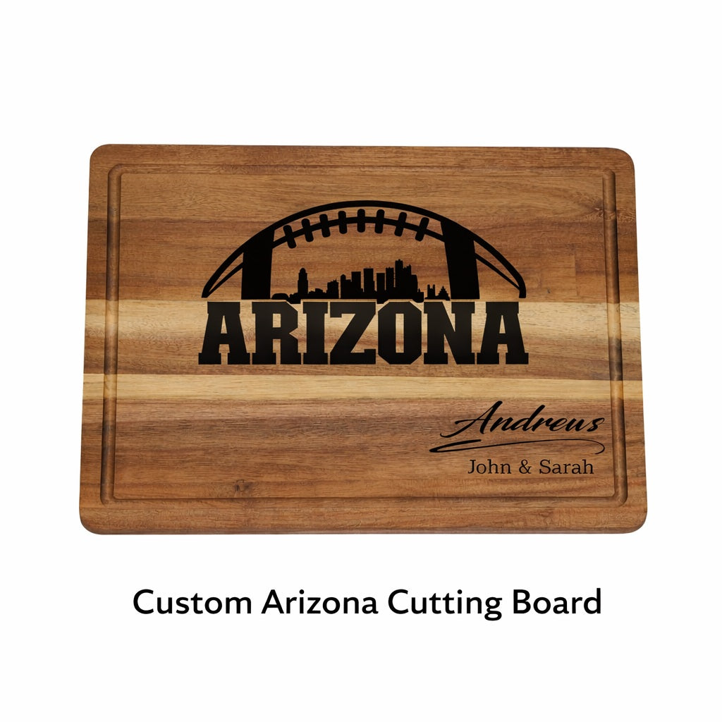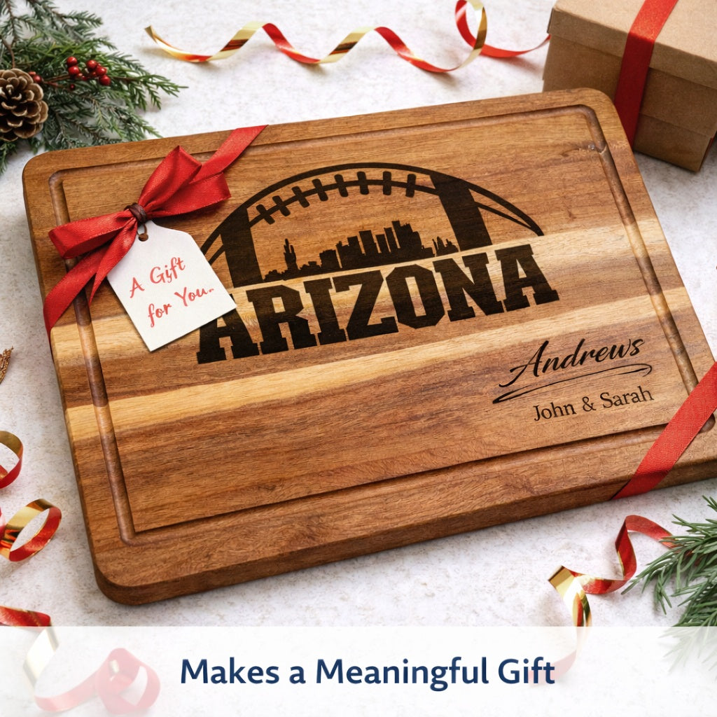 Celebrate Arizona football and family tradition with a custom engraved acacia wood cutting board crafted for both function and keepsake value. Each board is engraved to order, making it a one-of-a-kind gift that looks just as good on the counter as it does on game day.