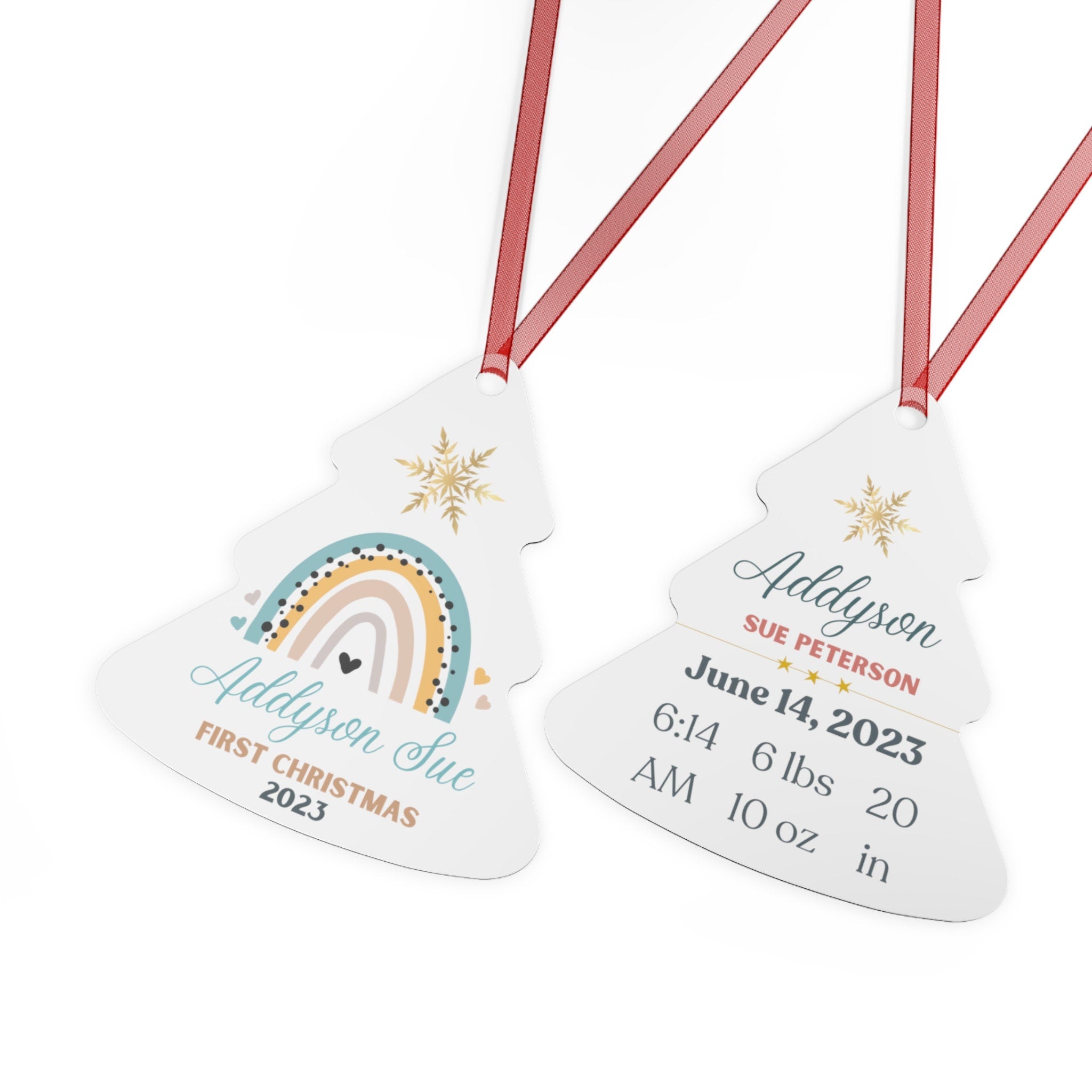 Surprise the new parents in your life with our personalized metal holiday ornament featuring an adorable Baby's First Christmas theme. This unique ornament makes a perfect gift for the holidays and adds a touch of festive cheer to any Christmas tree. It's also an excellent stocking stuffer for the new parents on your shopping list. Perfect as well for Baby Showers.