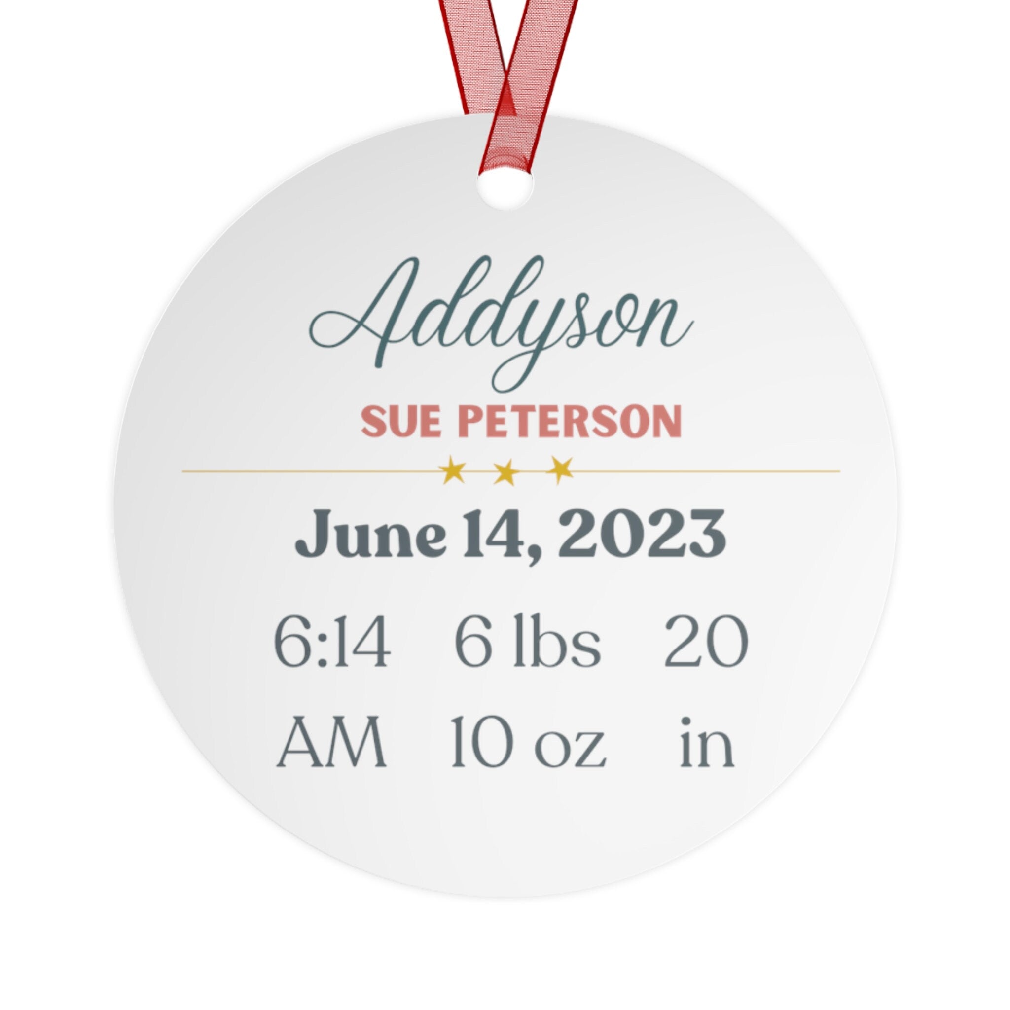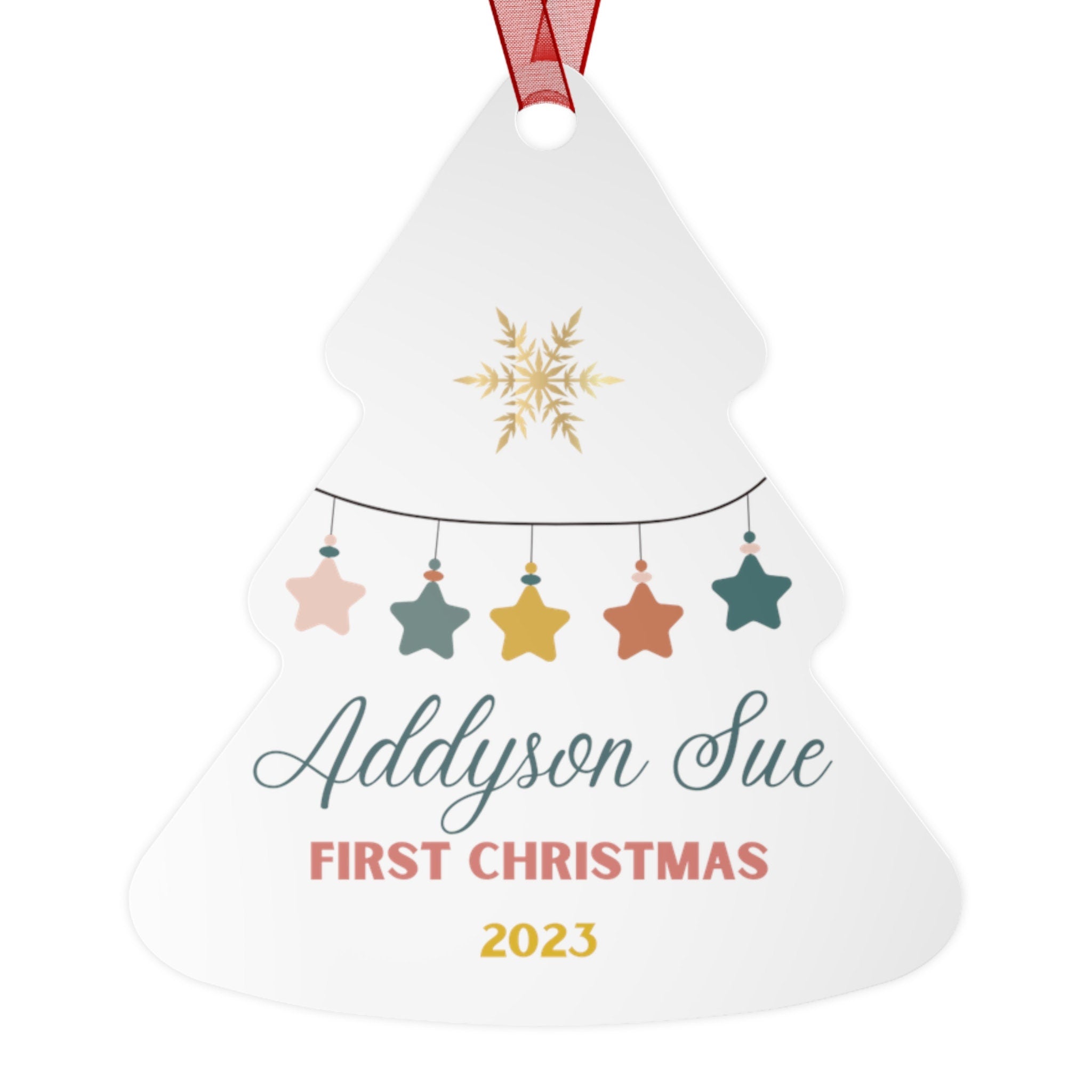 Surprise the new parents in your life with our personalized metal holiday ornament featuring an adorable Baby's First Christmas theme. This unique ornament makes a perfect gift for the holidays and adds a touch of festive cheer to any Christmas tree. It's also an excellent stocking stuffer for the new parents on your shopping list. Perfect as well for Baby Showers.