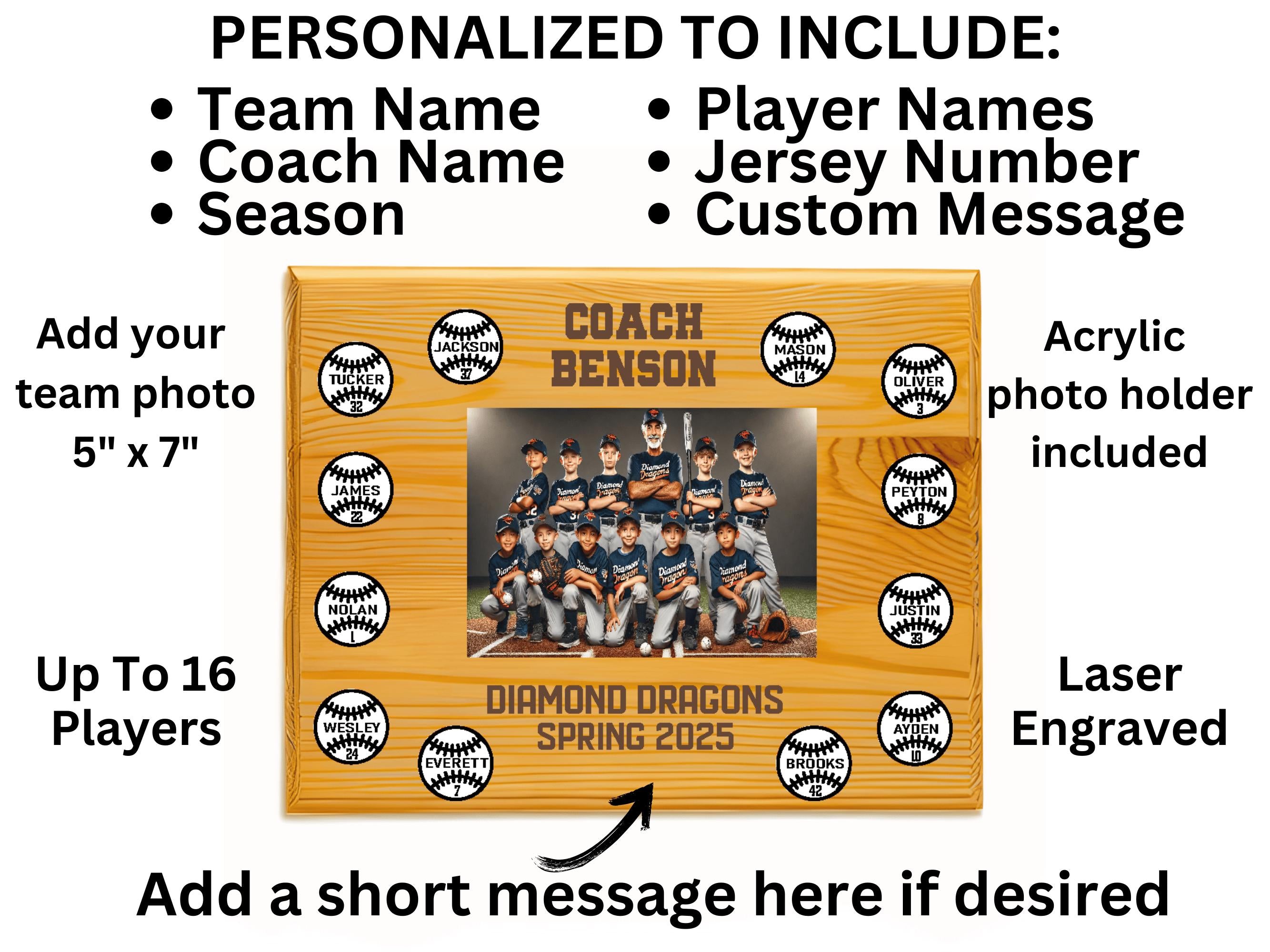 Show your appreciation for your coachโs hard work and dedication with this custom laser-cut wooden baseball plaque. Designed to commemorate a fantastic season, this high-quality award is the perfect way to say "Thank You" with a personalized touch and a team photo! You can either print and insert your 5x7 photo or we can do it for you. You will need to upload a quality image for us to print if you choose the second option.