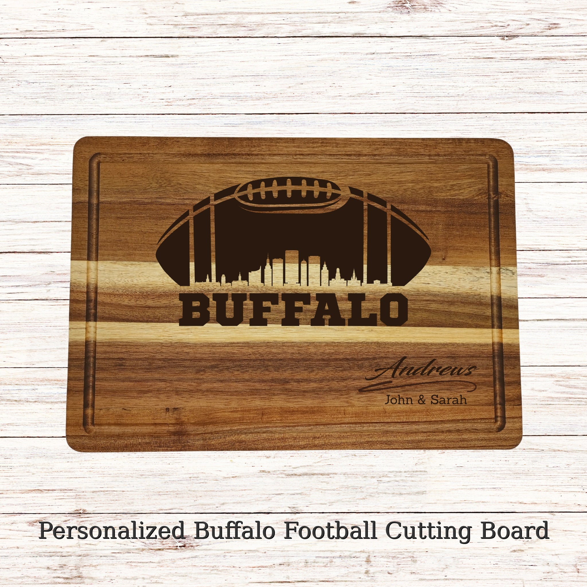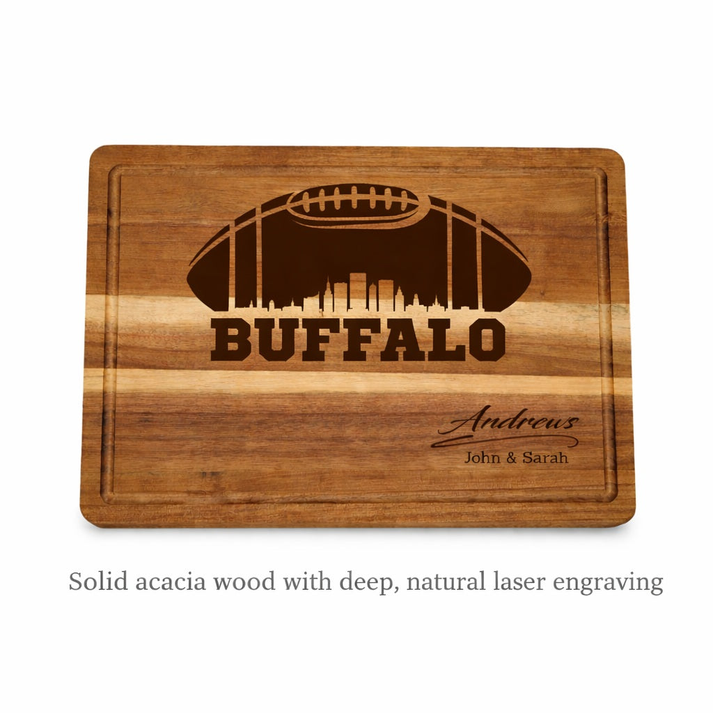 Celebrate Buffalo football and family tradition with a custom engraved acacia wood cutting board crafted for both function and keepsake value. Each board is engraved to order, making it a one-of-a-kind gift that looks just as good on the counter as it does on game day.