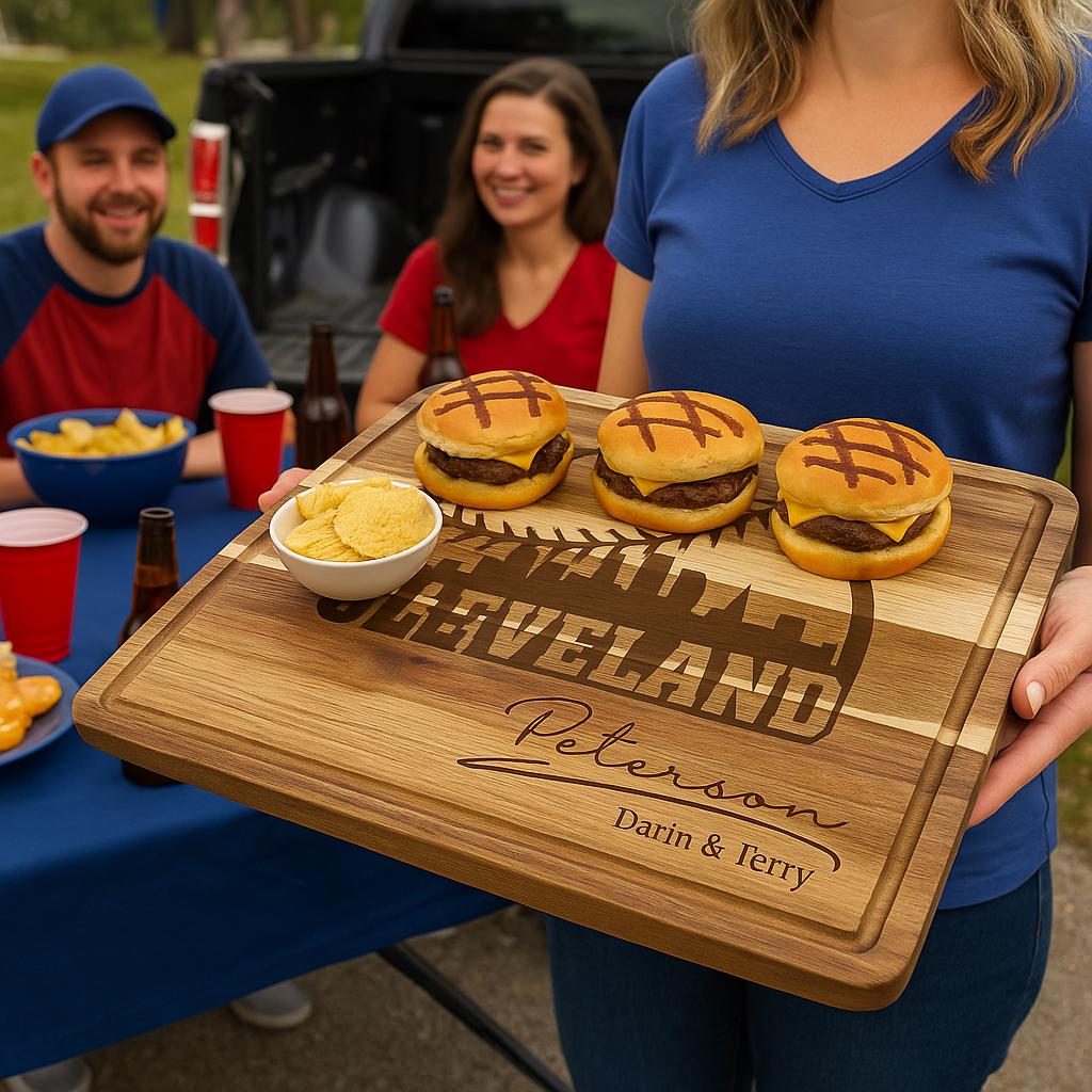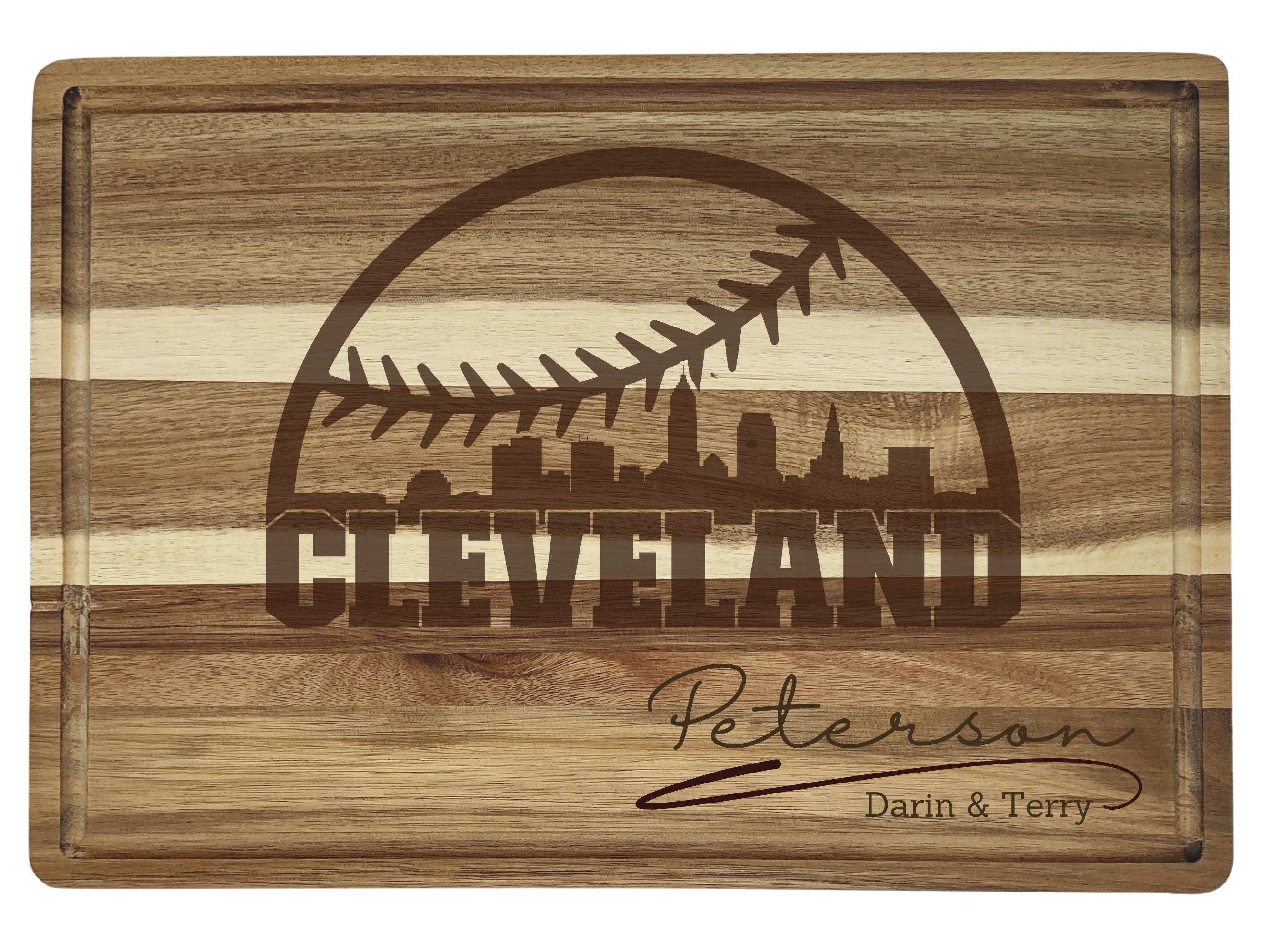 Show your Cleveland pride with our Personalized Cleveland Baseball Cutting Board! This premium acacia wood board features a laser-engraved Cleveland skyline framed by baseball stitching β the perfect blend of hometown spirit and everyday functionality.