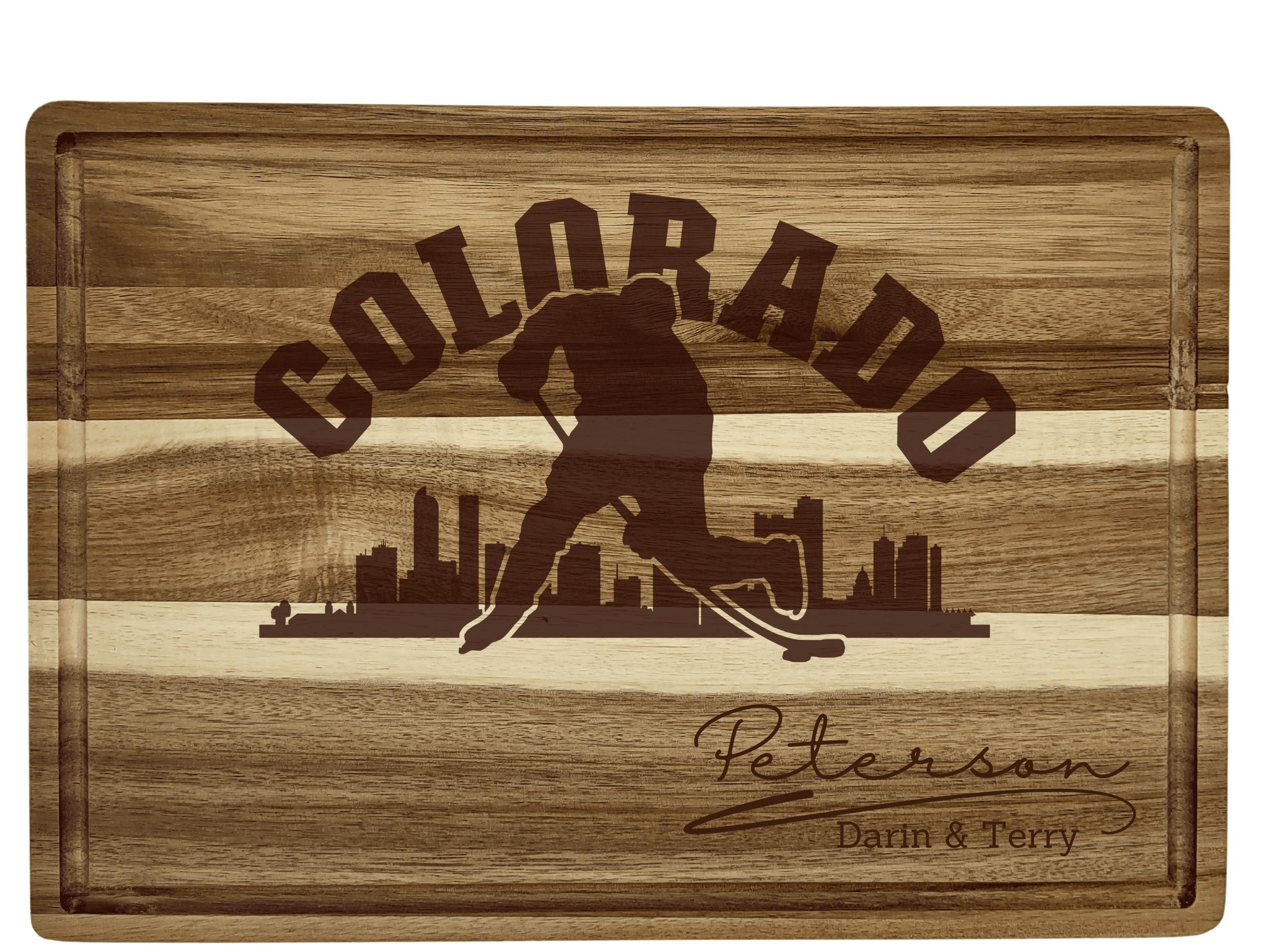 Looking for a thoughtful and unique gift for the Colorado Hockey fan in your life? How about that perfect accessory for your hockey party? Our custom cutting boards are the perfect choice! Crafted from sustainable acacia wood, these cutting boards add a touch of elegance to any kitchen. Personalized with precision using our laser engraving process, they make a memorable and functional gift for various occasions.