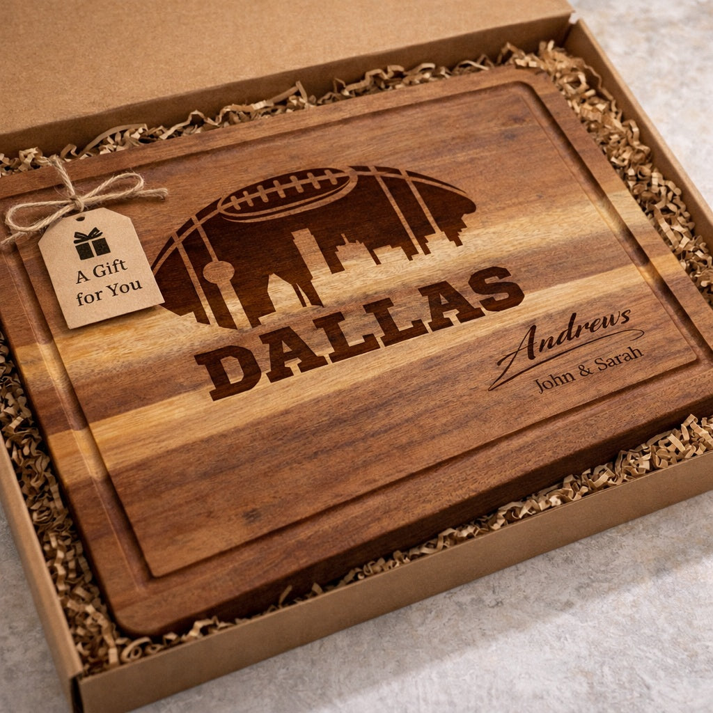 Celebrate Dallas football and family tradition with a custom engraved acacia wood cutting board crafted for both function and keepsake value. Each board is engraved to order, making it a one-of-a-kind gift that looks just as good on the counter as it does on game day.