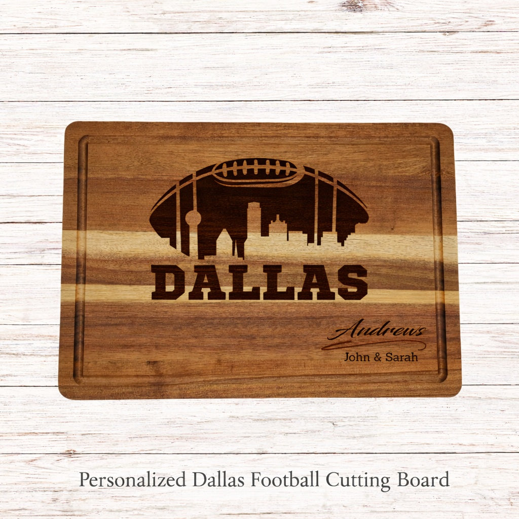 Personalized Dallas football cutting board, custom laser engraved on solid acacia wood. Designed for football fans, families, and meaningful gift giving. Durable enough for everyday use and beautiful enough for display.