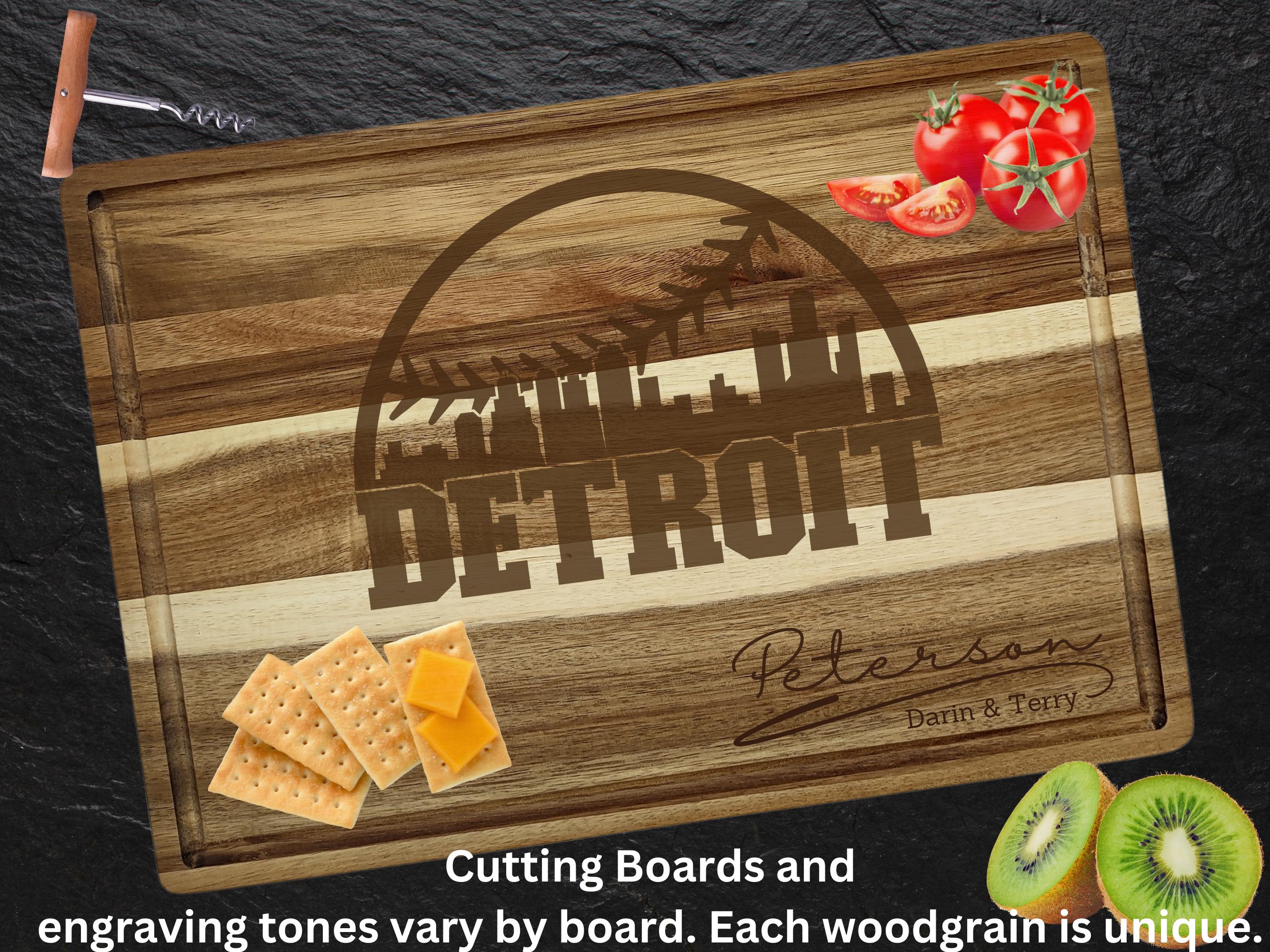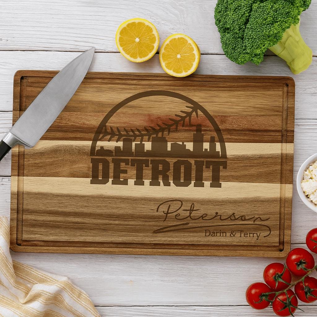 Show your Detroit pride with our Personalized Michigan Baseball Cutting Board! This premium acacia wood board features a laser-engraved Detroit skyline framed by baseball stitching β the perfect blend of hometown spirit and everyday functionality.
