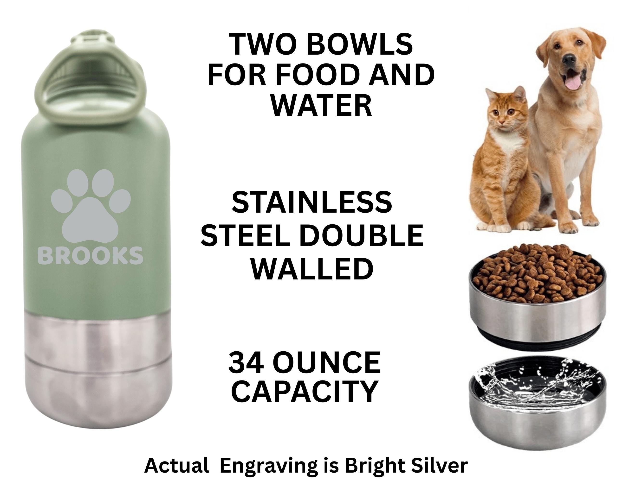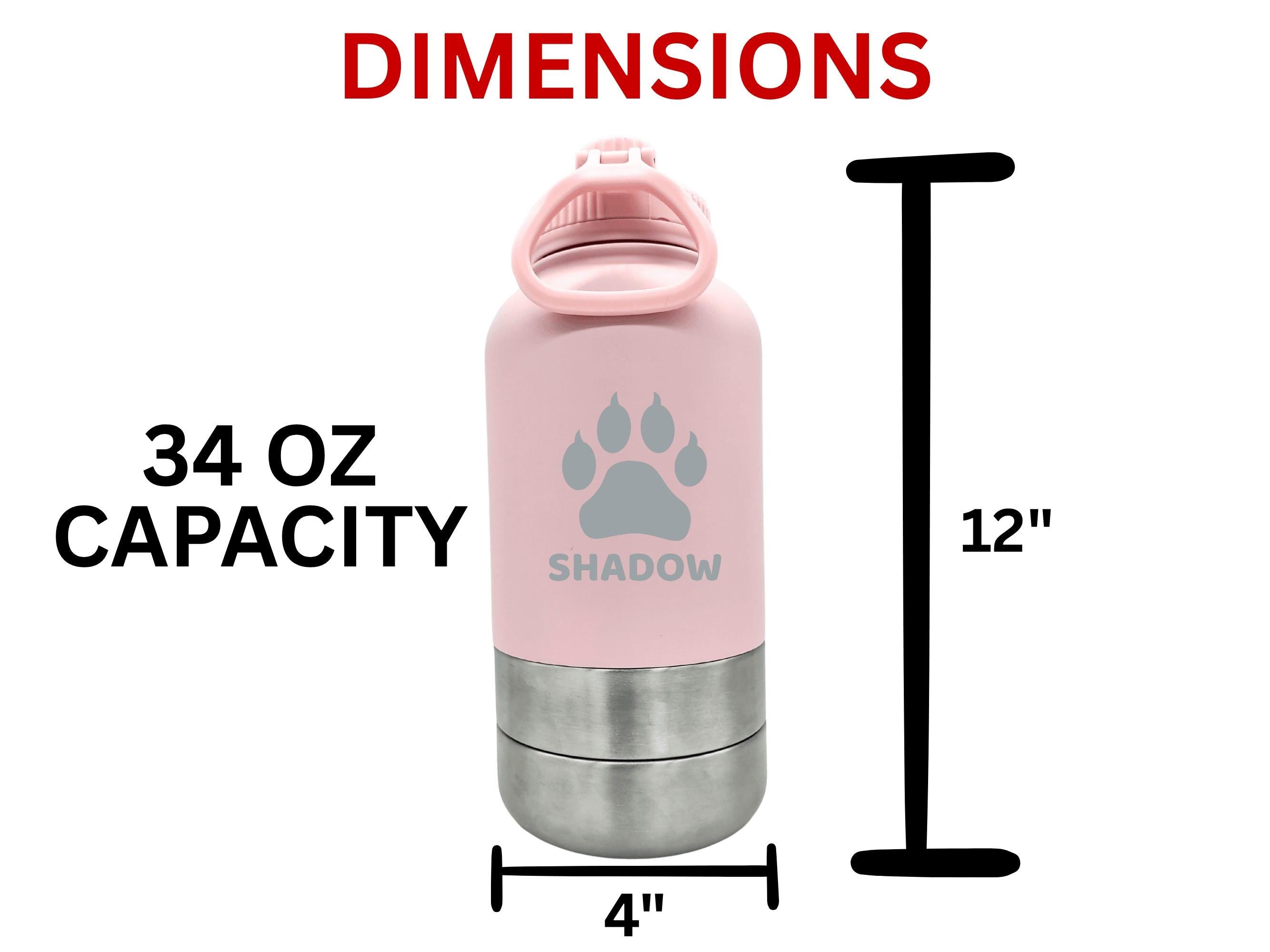 Keep your furry friend hydrated and happy with our custom 3-in-1 stainless steel pet water bottle. Personalized with your pet’s name, includes snack compartments & carrier – perfect for walks, hikes, and travel.