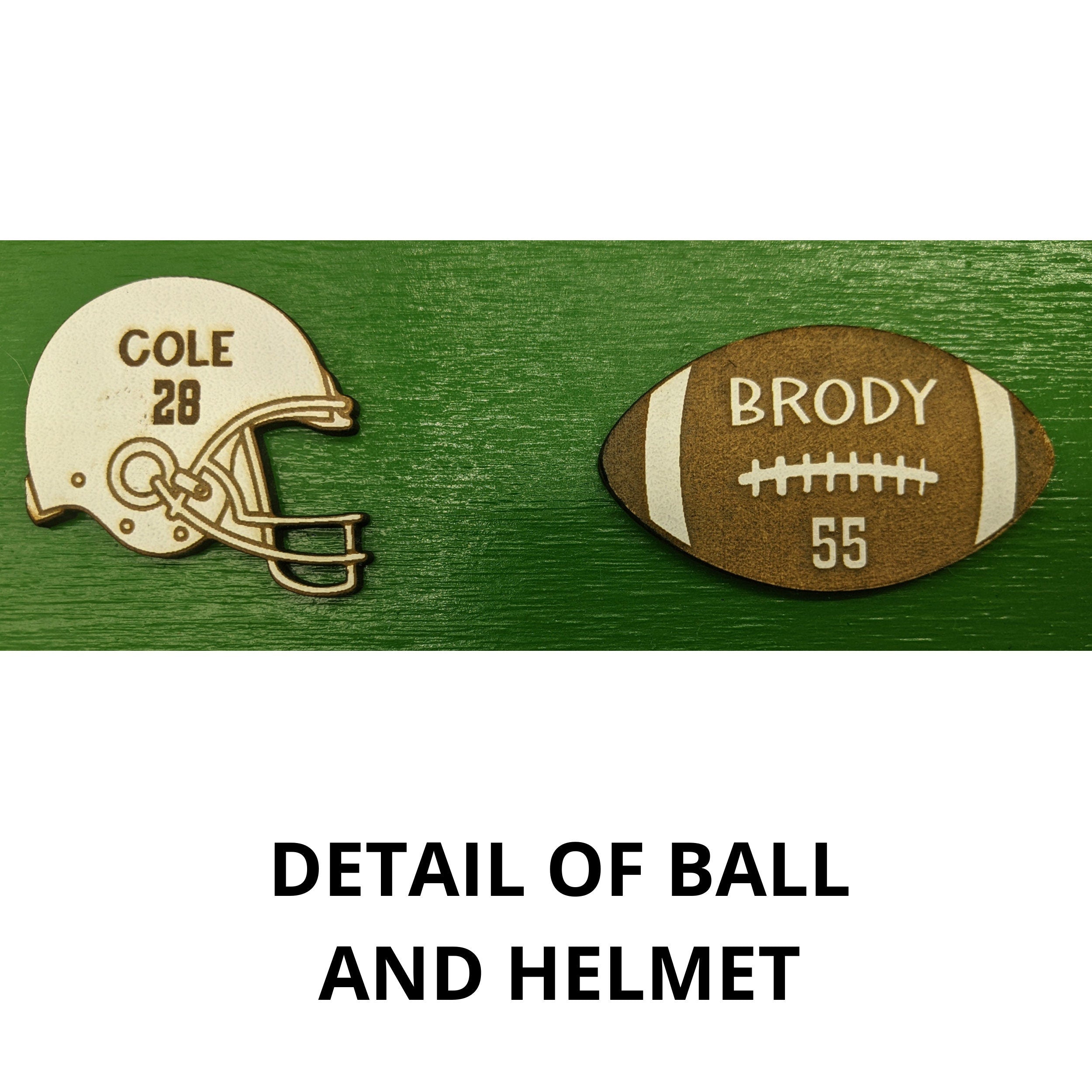 The wooden plaque features laser-cut decorative pieces, including football helmets and footballs, each customized with a player's name from your team. The goalpost area is expertly engraved with the coach's name, team name, and the season, adding a personal touch that will be cherished for years to come.
