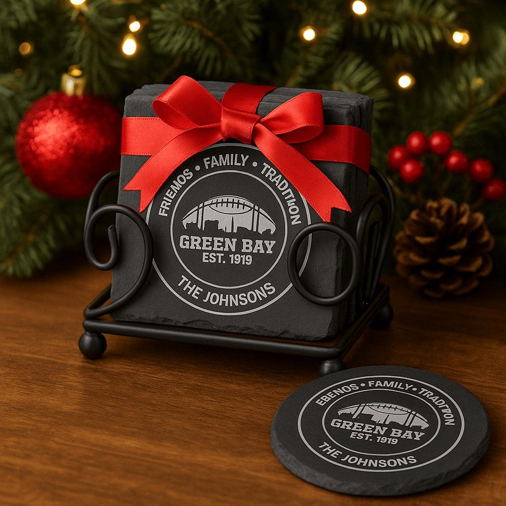 Celebrate Friends, Family & Tradition with our Personalized Green Bay Football Coaster Set, custom engraved with your family name for a one-of-a-kind keepsake. Each set includes four natural slate coasters, available in square or round designs, and can be paired with an optional decorative coaster holder for easy display and storage. Choose from several holder styles β from rustic scroll iron to sleek dark walnut wood β to suit your home decor. Whether youβre cheering for Green Bay on game day or searching for a memorable holiday, housewarming, or cabin gift, these engraved coasters make every gathering feel special.