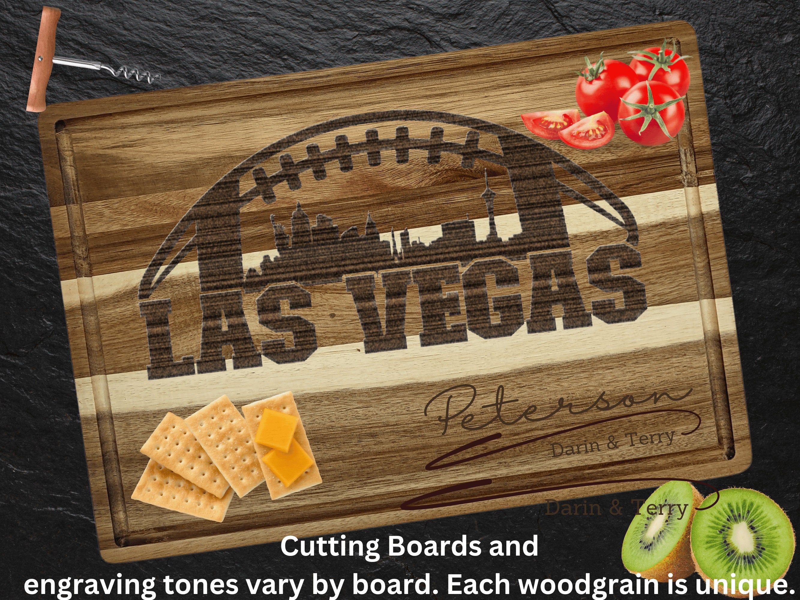 Looking for a thoughtful and unique gift for a Las Vegas football fan? Or maybe the perfect serving piece for your Super Bowl party spread? This personalized acacia wood cutting board blends elegance, durability, and football pride. Precision laser engraving ensures each board is one-of-a-kind, making it both a keepsake and a practical kitchen essential.