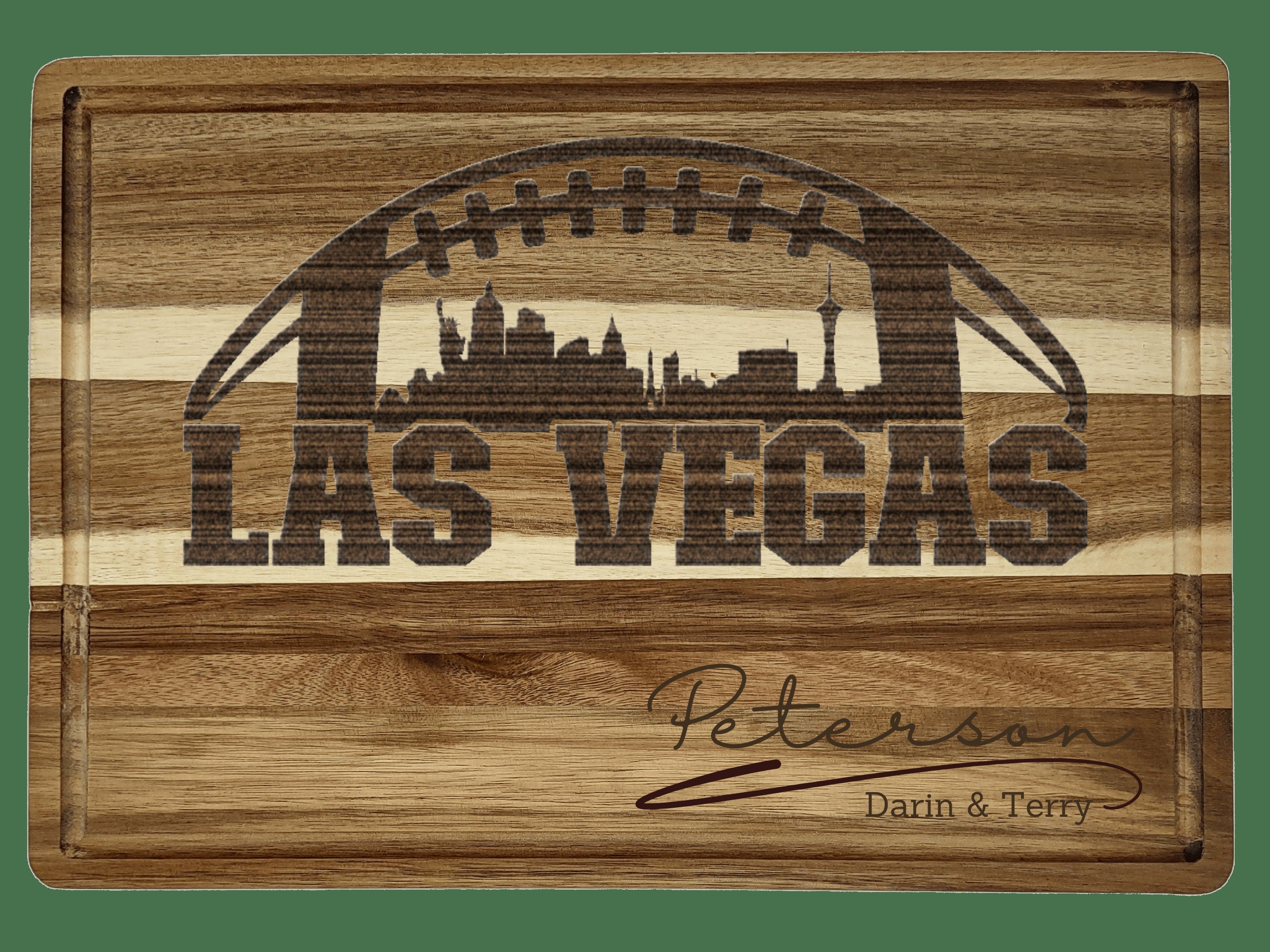 Looking for a thoughtful and unique gift for the Las Vegas football fan in your life? How about that perfect accessory for your Super Bowl party? Our custom cutting boards are the perfect choice! Crafted from sustainable acacia wood, these cutting boards add a touch of elegance to any kitchen. Personalized with precision using our laser engraving process, they make a memorable and functional gift for various occasions.