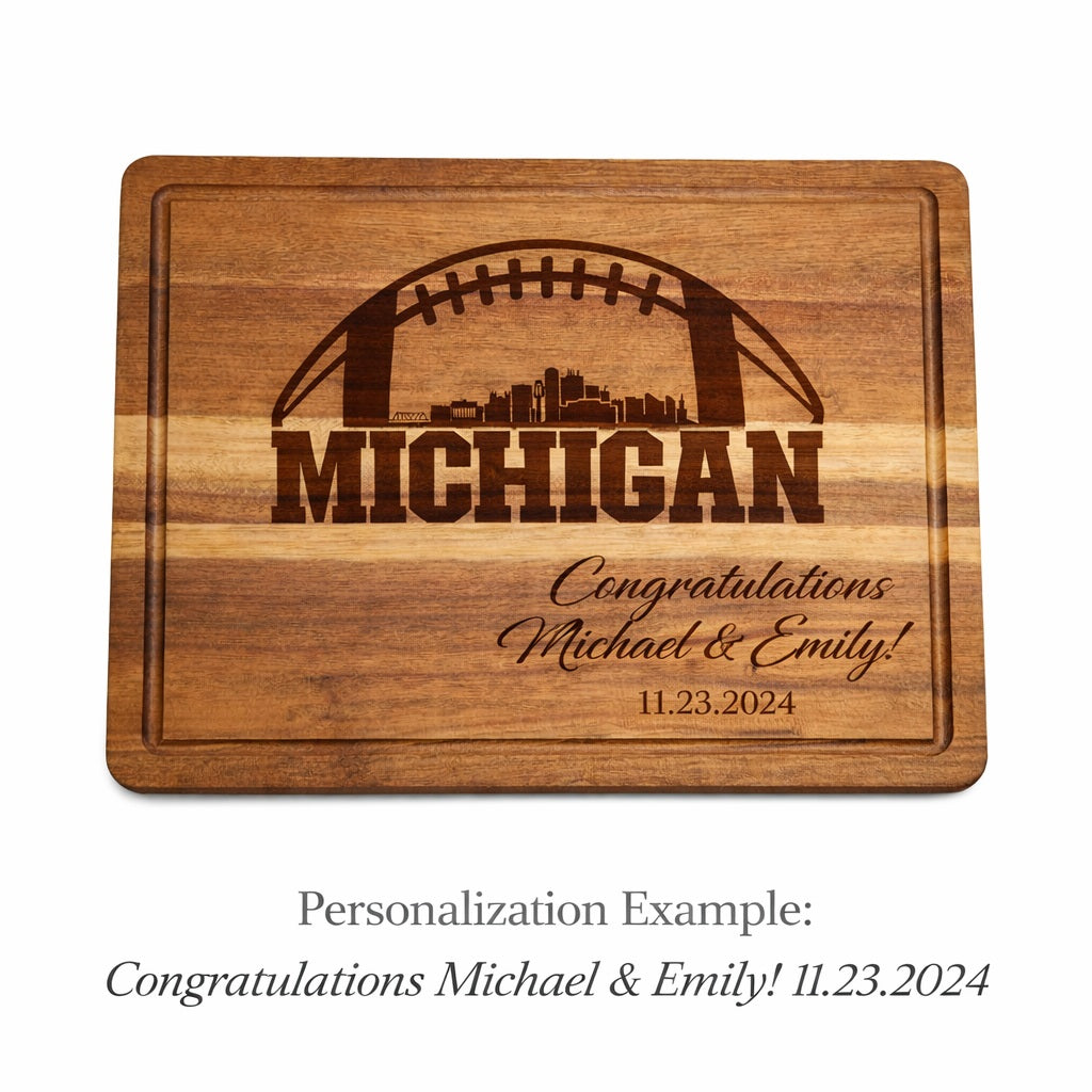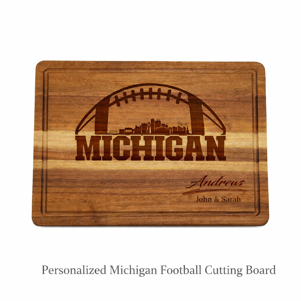 Personalized Michigan football cutting board, custom laser engraved on solid acacia wood. Designed for football fans, families, and meaningful gift giving. Durable enough for everyday use and beautiful enough for display.