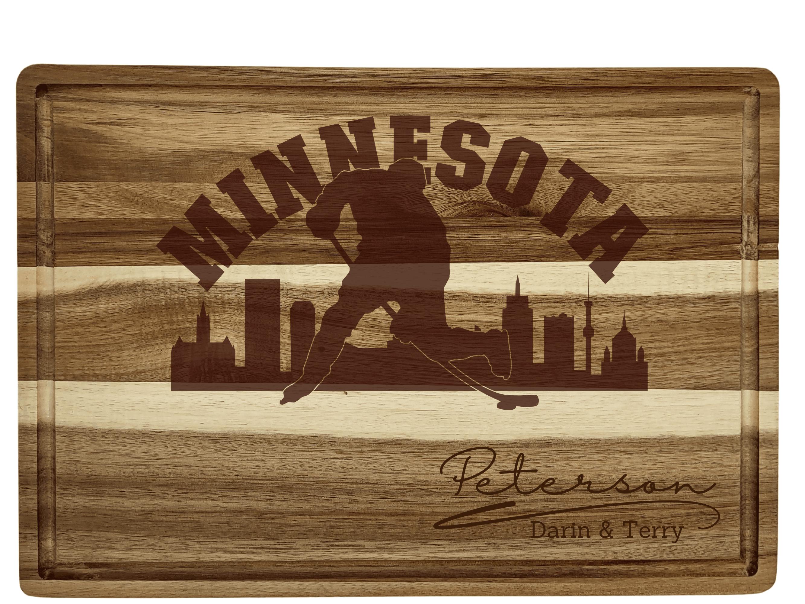 Looking for a thoughtful and unique gift for the Minnesota Hockey fan in your life? How about that perfect accessory for your hockey party? Our custom cutting boards are the perfect choice! Crafted from sustainable acacia wood, these cutting boards add a touch of elegance to any kitchen. Personalized with precision using our laser engraving process, they make a memorable and functional gift for various occasions.