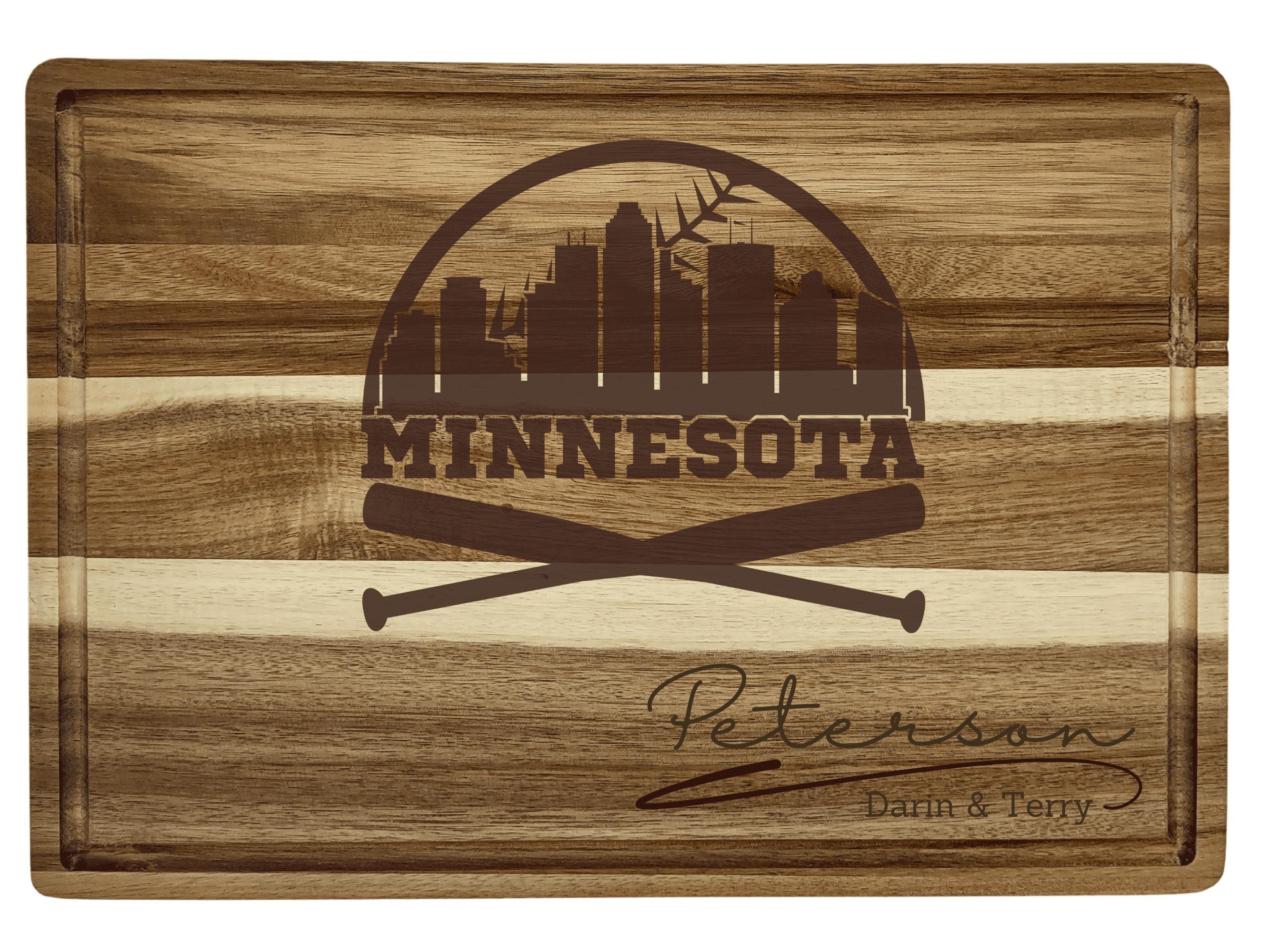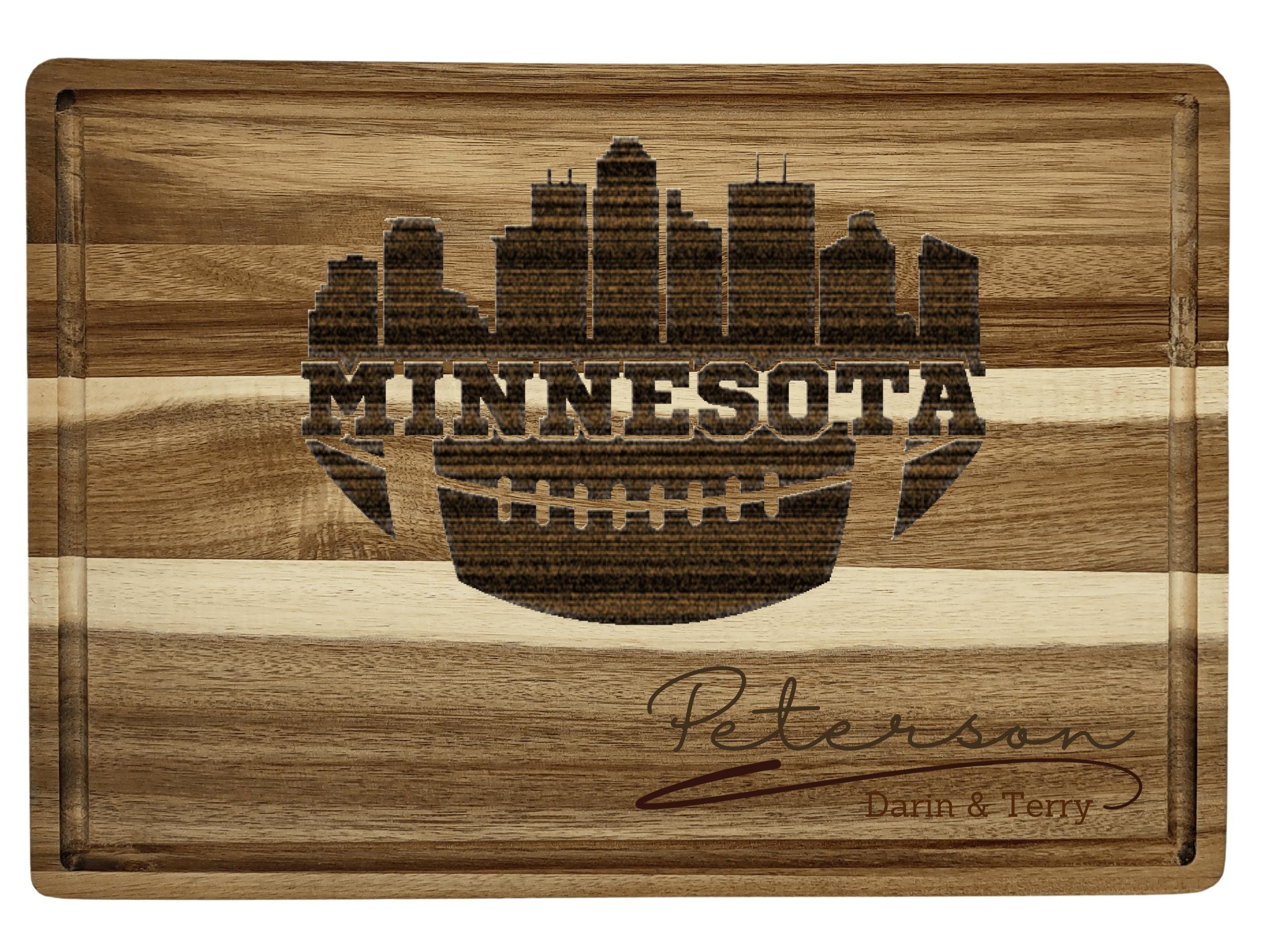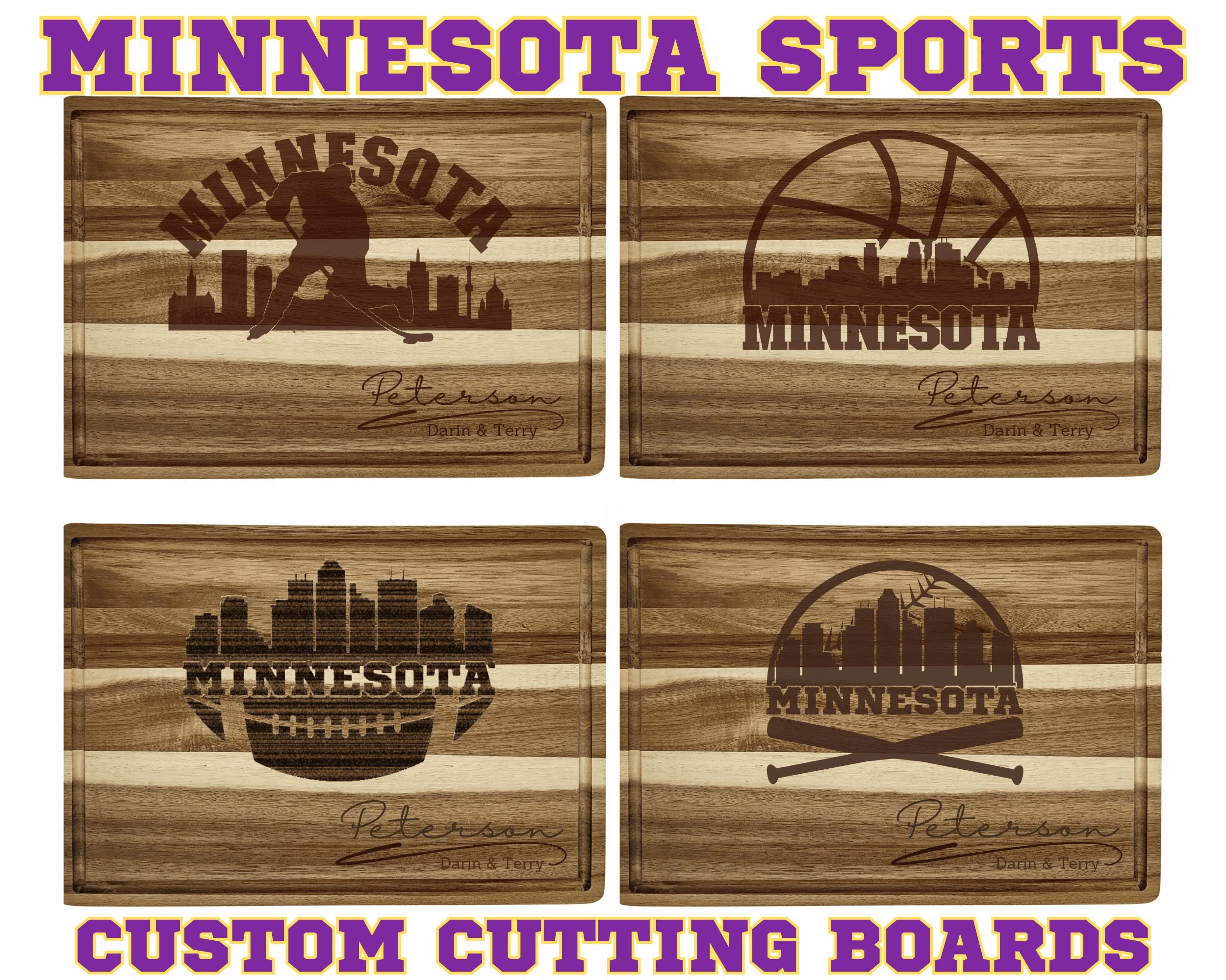 Looking for a thoughtful and unique gift for the Minnesota sports fan in your life? How about that perfect accessory for your sports party? Our custom cutting boards are the perfect choice! Crafted from sustainable acacia wood, these cutting boards add a touch of elegance to any kitchen. Personalized with precision using our laser engraving process, they make a memorable and functional gift for various occasions. Choose from hockey, football, baseball, and basketball designs.