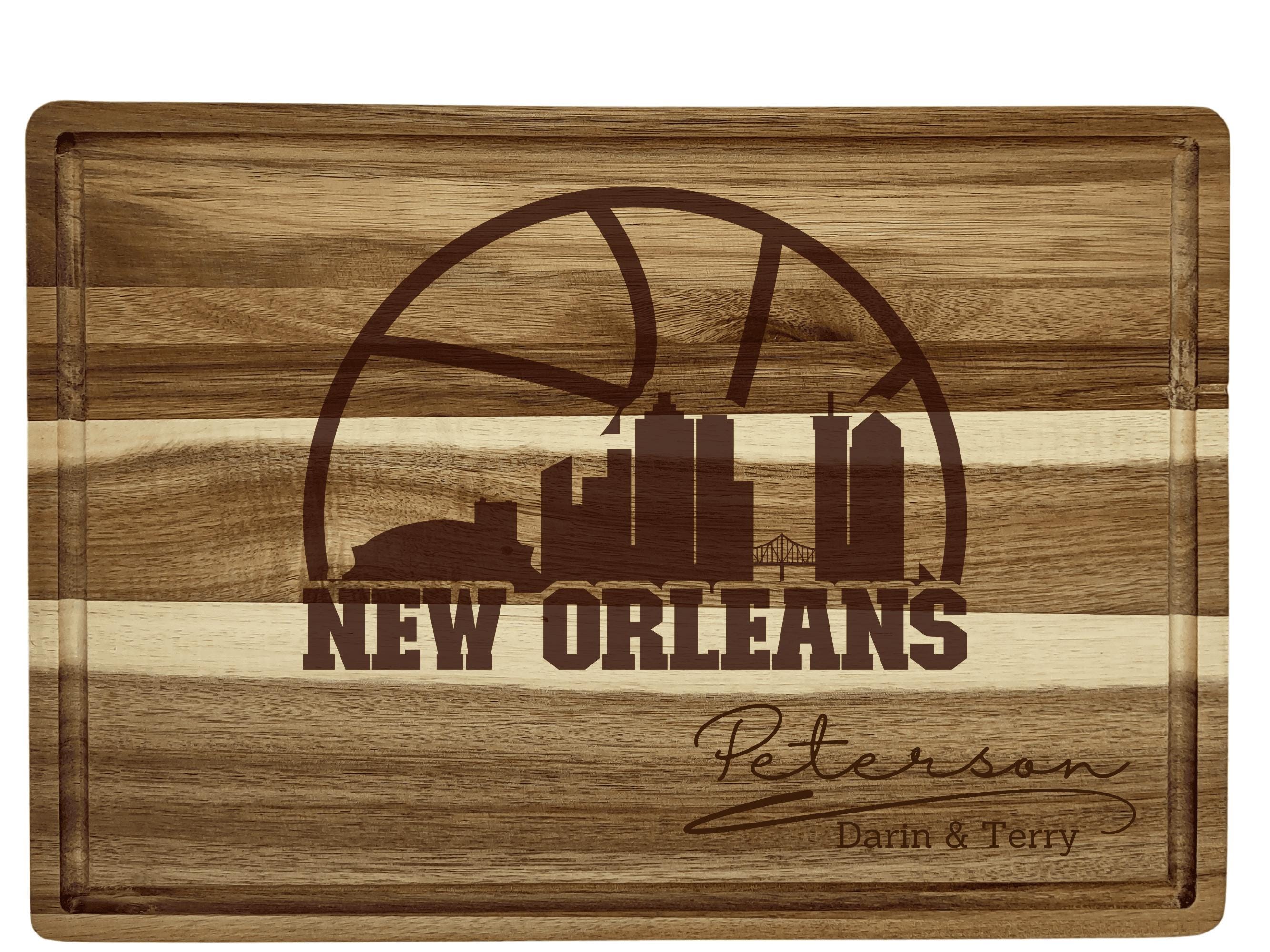 Looking for a thoughtful and unique gift for the New Orleans Basketball fan in your life? How about that perfect accessory for your hoops party? Our custom cutting boards are the perfect choice! Crafted from sustainable acacia wood, these cutting boards add a touch of elegance to any kitchen. Personalized with precision using our laser engraving process, they make a memorable and functional gift for various occasions.